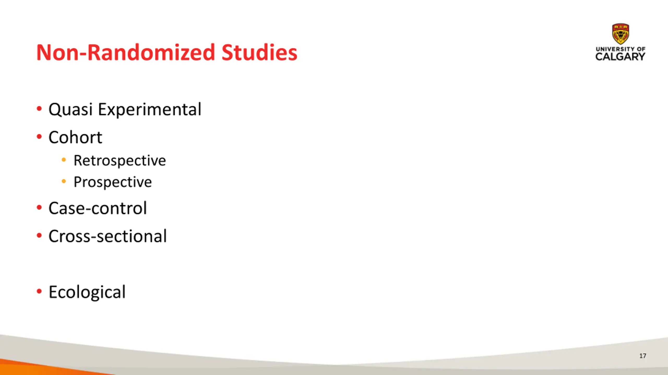Non-Randomized Studies Quasi Experimental Cohort Retrospective Prospective Case-control Cross-sectional Ecological 17