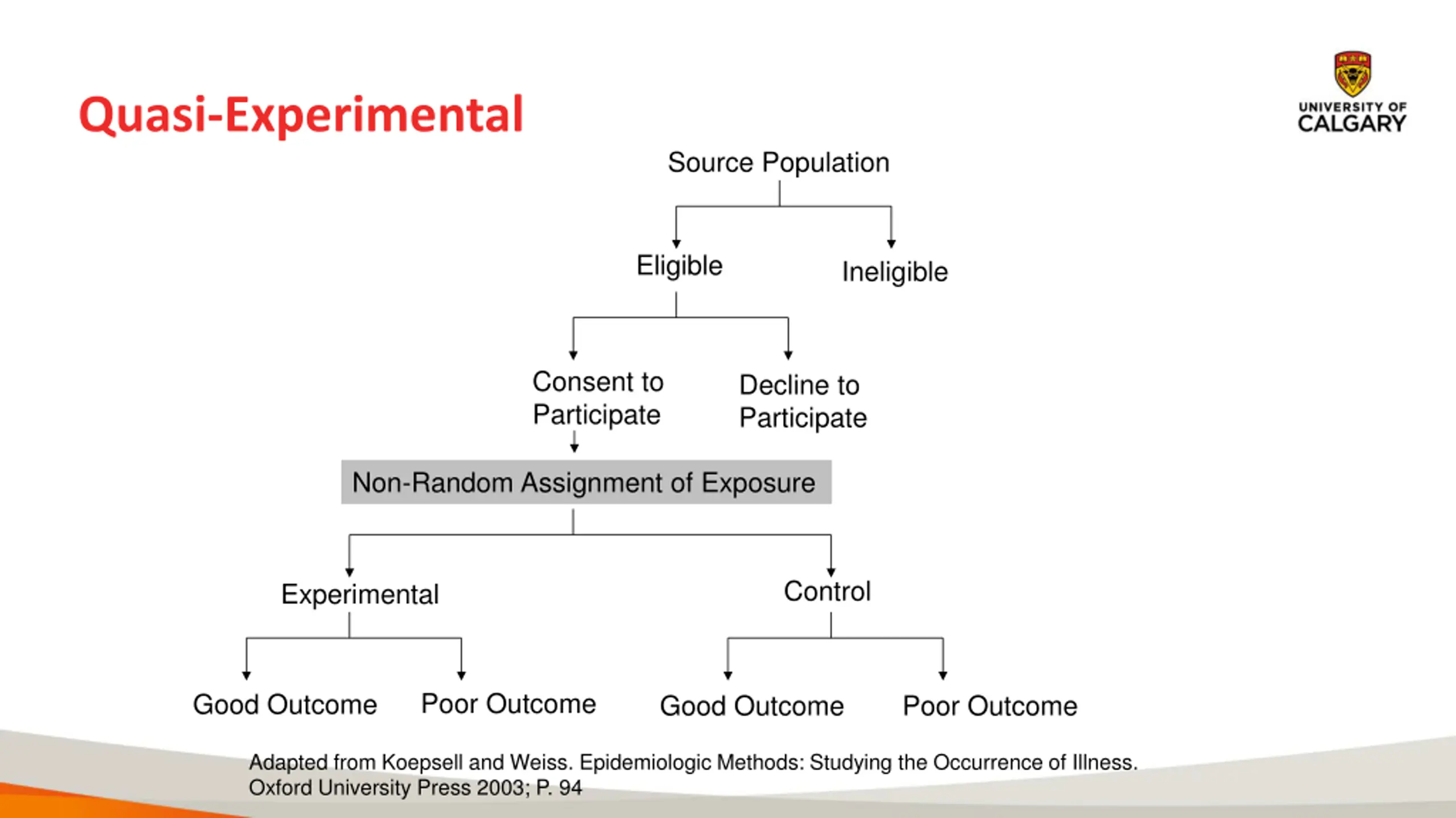 Quasi-Experimental Source Population Eligible Ineligible Consent to Participate Decline to Participate Non-Random Assignment of Exposure Control Experimental Poor Outcome Good Outcome Good Outcome Poor Outcome Adapted from Koepsell and Weiss. Epidemiologic Methods: Studying the Occurrence of Illness. Oxford University Press 2003; P. 94