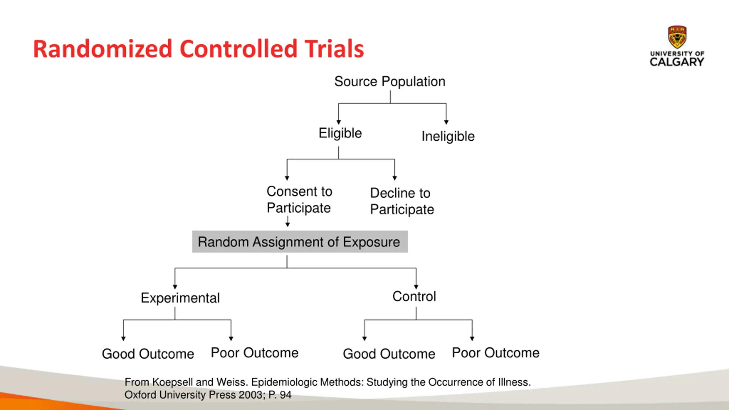 Randomized Controlled Trials Source Population Eligible Ineligible Consent to Participate Decline to Participate Random Assignment of Exposure Control Experimental Poor Outcome Poor Outcome Good Outcome Good Outcome From Koepsell and Weiss. Epidemiologic Methods: Studying the Occurrence of Illness. Oxford University Press 2003; P. 94