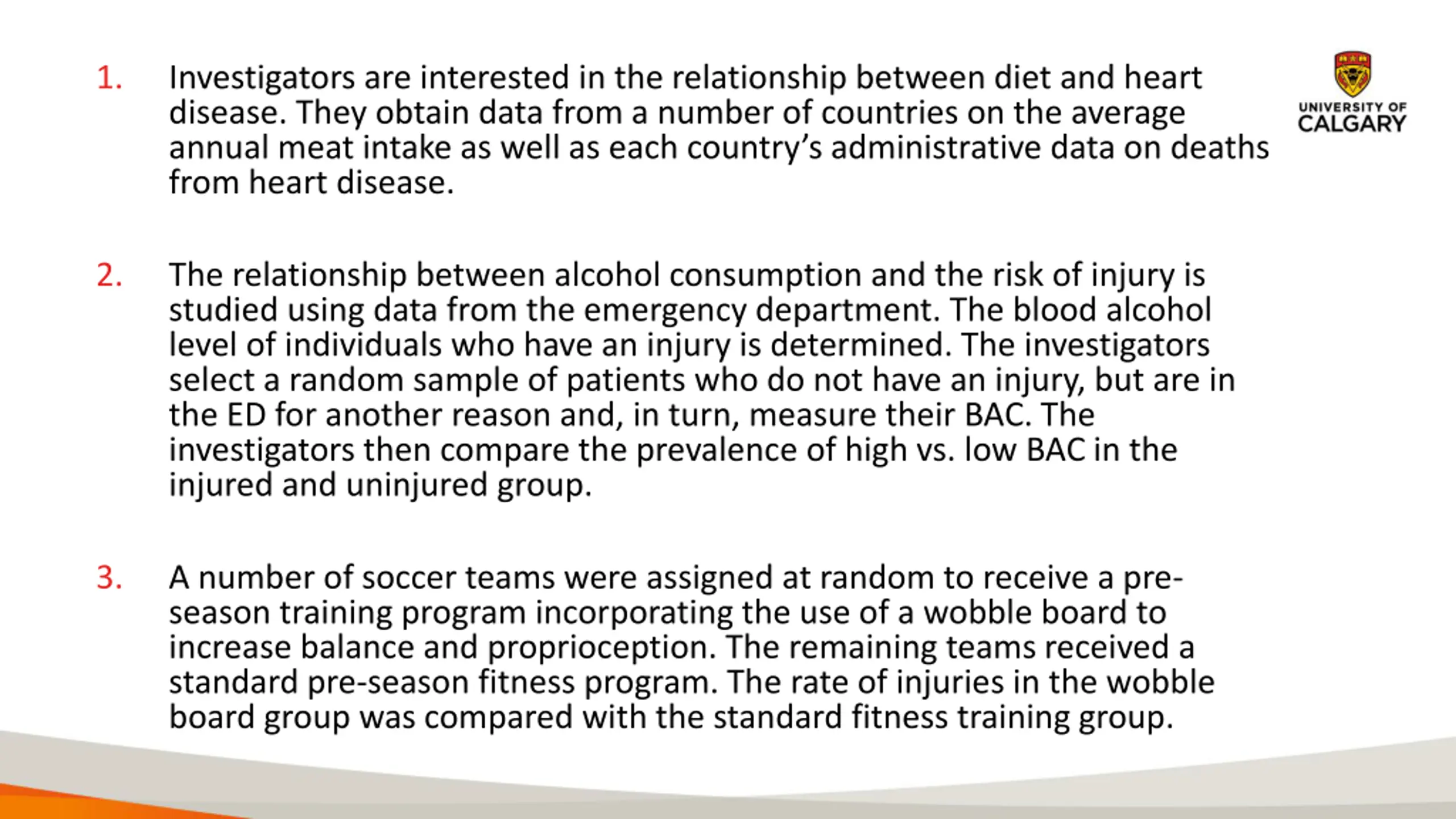 1. Investigators are interested in the relationship between diet and heart disease. They obtain data from a number of countries on the average annual meat intake as well as each country s administrative data on deaths from heart disease. 2. The relationship between alcohol consumption and the risk of injury is studied using data from the emergency department. The blood alcohol level of individuals who have an injury is determined. The investigators select a random sample of patients who do not have an injury, but are in the ED for another reason and, in turn, measure their BAC. The investigators then compare the prevalence of high vs. low BAC in the injured and uninjured group. 3. A number of soccer teams were assigned at random to receive a pre- season training program incorporating the use of a wobble board to increase balance and proprioception. The remaining teams received a standard pre-season fitness program. The rate of injuries in the wobble board group was compared with the standard fitness training group.