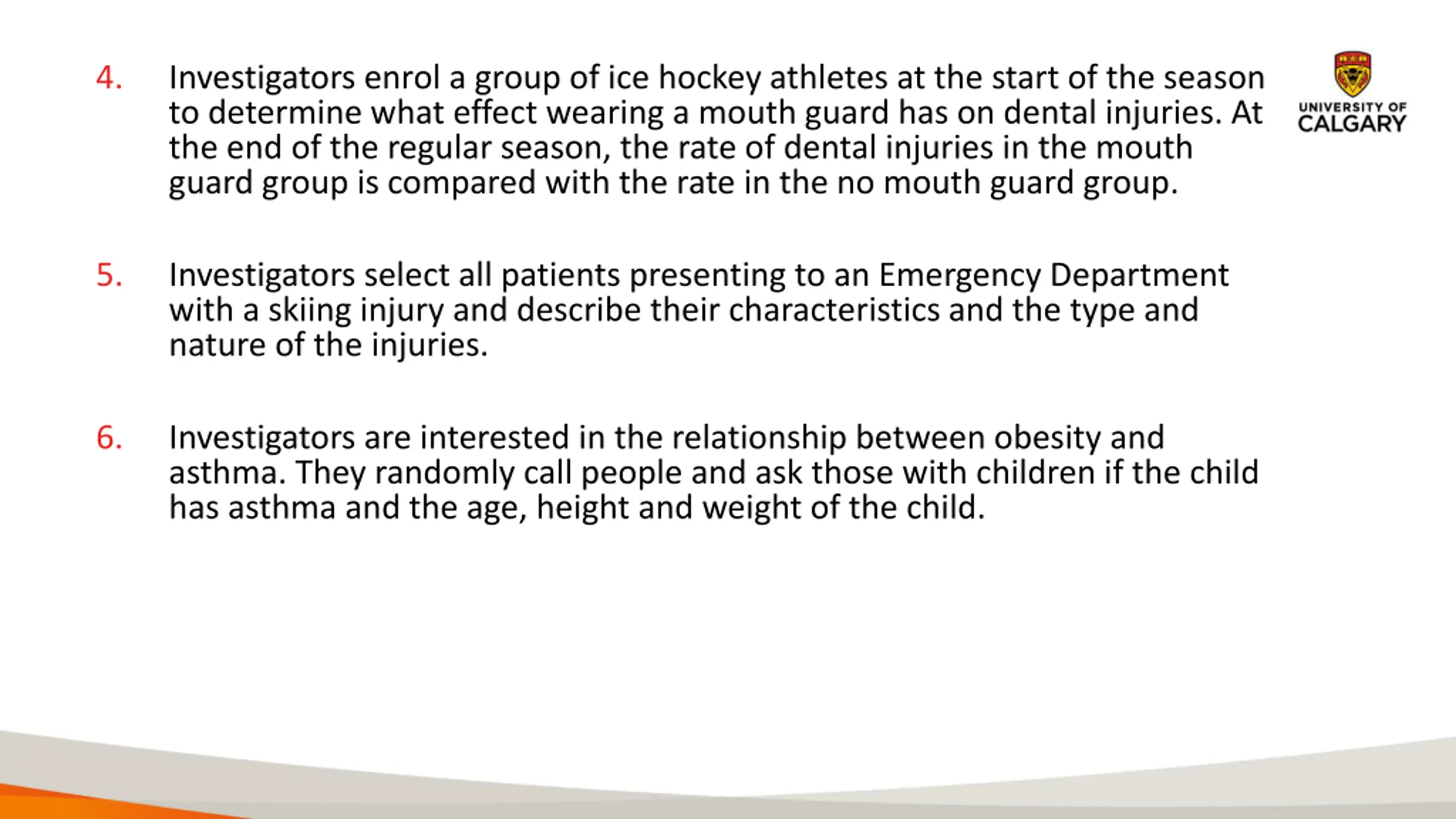 4. Investigators enrol a group of ice hockey athletes at the start of the season to determine what effect wearing a mouth guard has on dental injuries. At the end of the regular season, the rate of dental injuries in the mouth guard group is compared with the rate in the no mouth guard group. 5. Investigators select all patients presenting to an Emergency Department with a skiing injury and describe their characteristics and the type and nature of the injuries. 6. Investigators are interested in the relationship between obesity and asthma. They randomly call people and ask those with children if the child has asthma and the age, height and weight of the child.