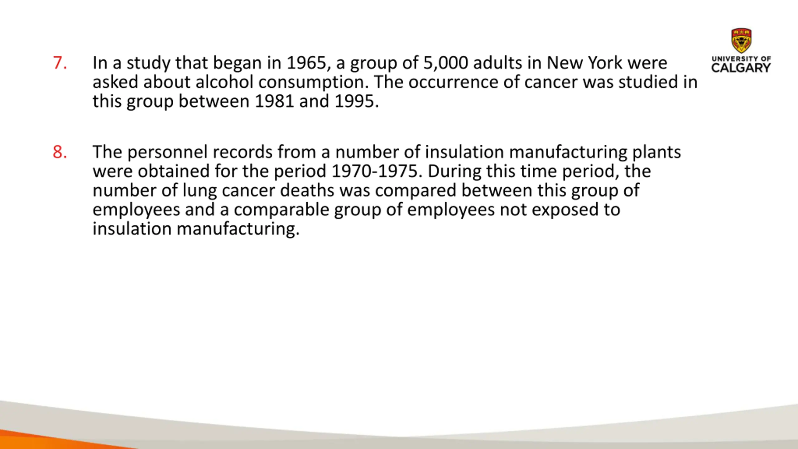 7. In a study that began in 1965, a group of 5,000 adults in New York were asked about alcohol consumption. The occurrence of cancer was studied in this group between 1981 and 1995. 8. The personnel records from a number of insulation manufacturing plants were obtained for the period 1970-1975. During this time period, the number of lung cancer deaths was compared between this group of employees and a comparable group of employees not exposed to insulation manufacturing.