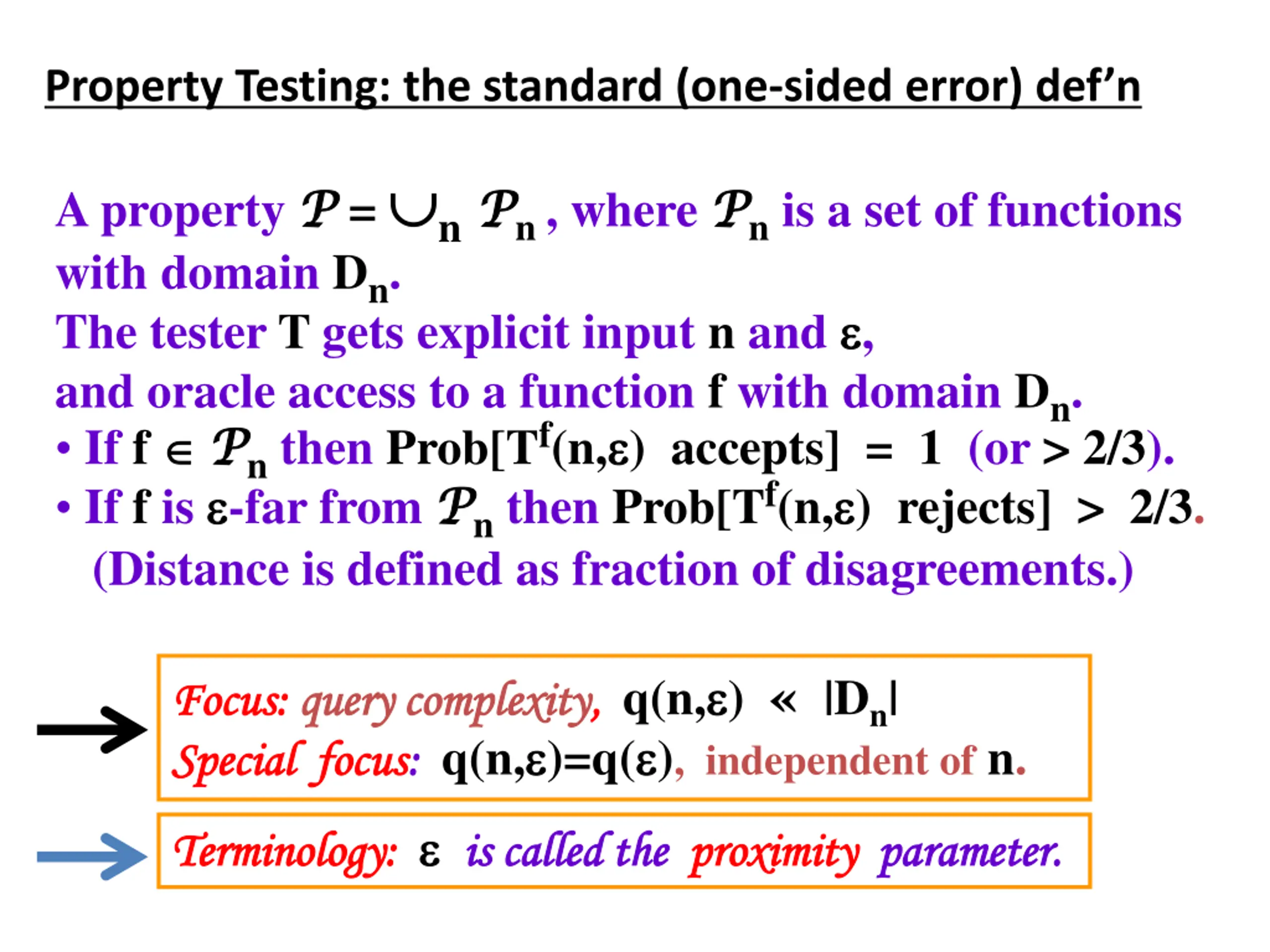 Property Testing: the standard (one-sided error) defn A property P P = nP Pn, where P Pnis a set of functions with domain Dn. The tester T gets explicit input n and , and oracle access to a function f with domain Dn. If f P Pnthen Prob[Tf(n, ) accepts] = 1 (or > 2/3). If f is -far from P Pnthen Prob[Tf(n, ) rejects] > 2/3. (Distance is defined as fraction of disagreements.) Focus: Focus: query complexity query complexity, , q(n, ) |Dn| Special focus Special focus: : q(n, )=q( ), independent of n. Terminology: Terminology: is called the is called the proximity proximity parameter. parameter.