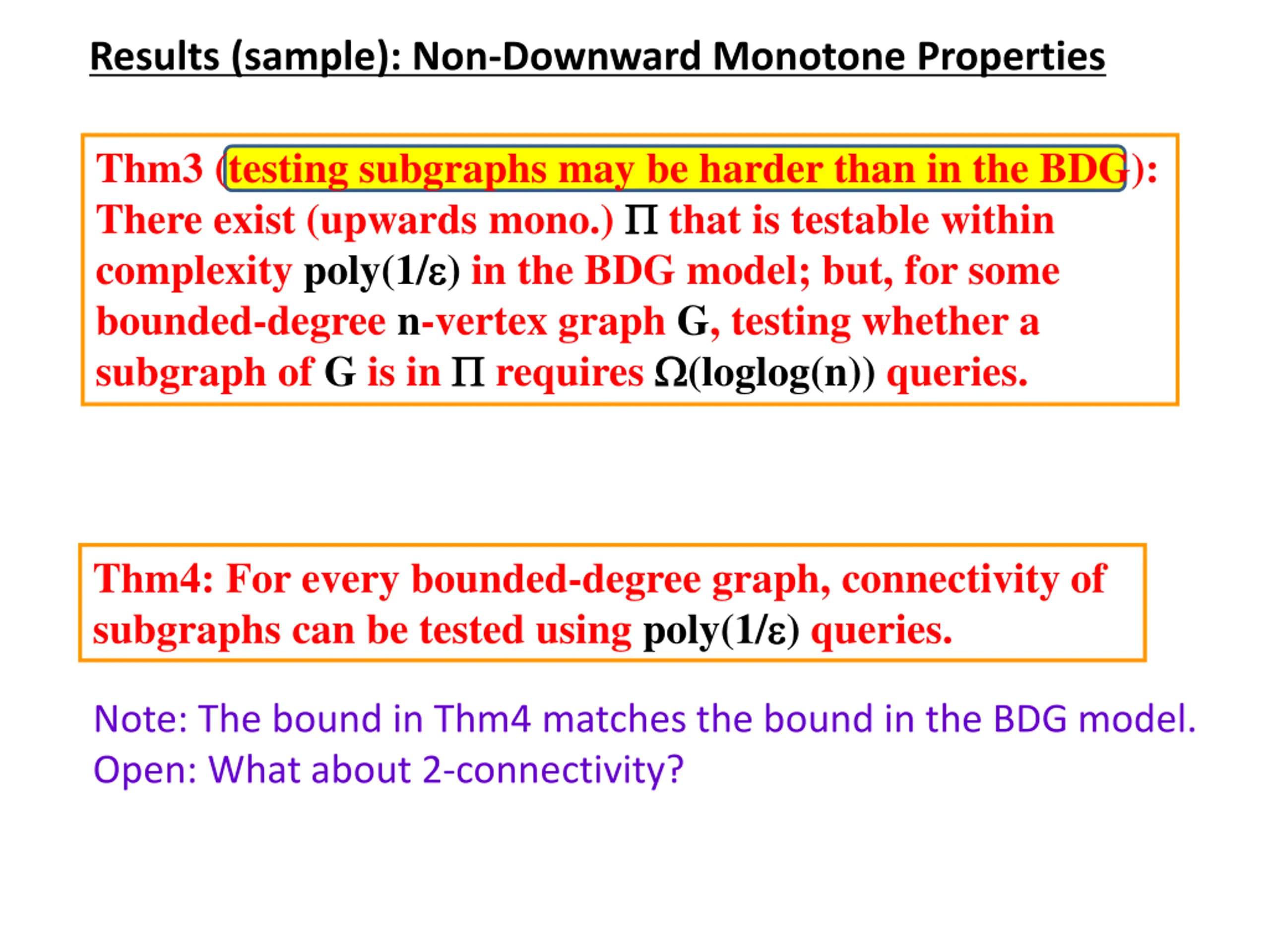 Results (sample): Non-Downward Monotone Properties Thm3 (testing subgraphs may be harder than in the BDG): There exist (upwards mono.) that is testable within complexity poly(1/ ) in the BDG model; but, for some bounded-degree n-vertex graph G, testing whether a subgraph of G is in requires (loglog(n)) queries. Thm4: For every bounded-degree graph, connectivity of subgraphs can be tested using poly(1/ ) queries. Note: The bound in Thm4 matches the bound in the BDG model. Open: What about 2-connectivity?