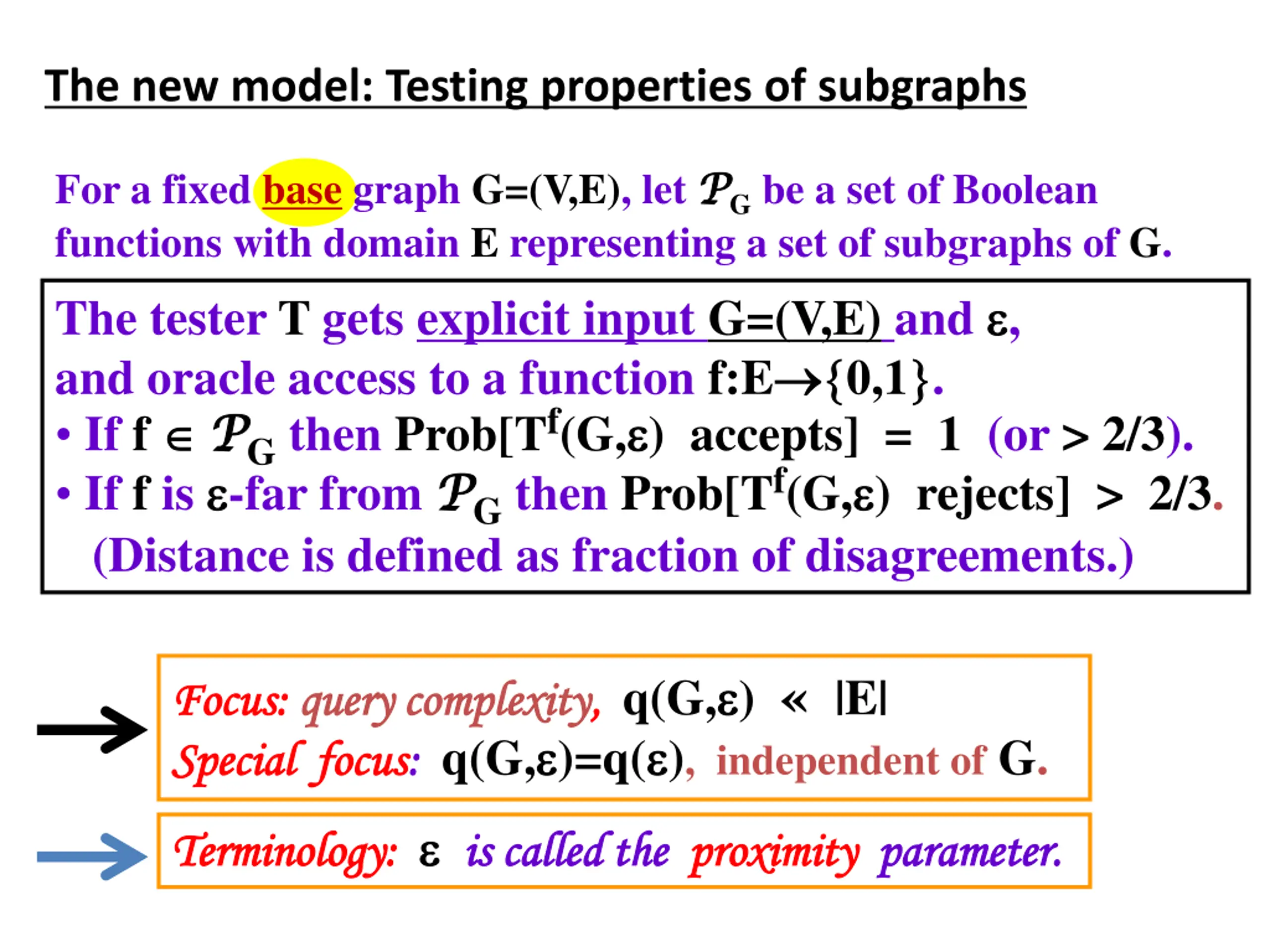 The new model: Testing properties of subgraphs For a fixed base graph G=(V,E), let P PGbe a set of Boolean functions with domain E representing a set of subgraphs of G. The tester T gets explicit input G=(V,E) and , and oracle access to a function f:E If f P PGthen Prob[Tf(G, ) accepts] = 1 (or > 2/3). If f is -far from P PGthen Prob[Tf(G, ) rejects] > 2/3. (Distance is defined as fraction of disagreements.) 0,1 . Focus: Focus: query complexity query complexity, , q(G, ) |E| Special focus Special focus: : q(G, )=q( ), independent of G. Terminology: Terminology: is called the is called the proximity proximity parameter. parameter.