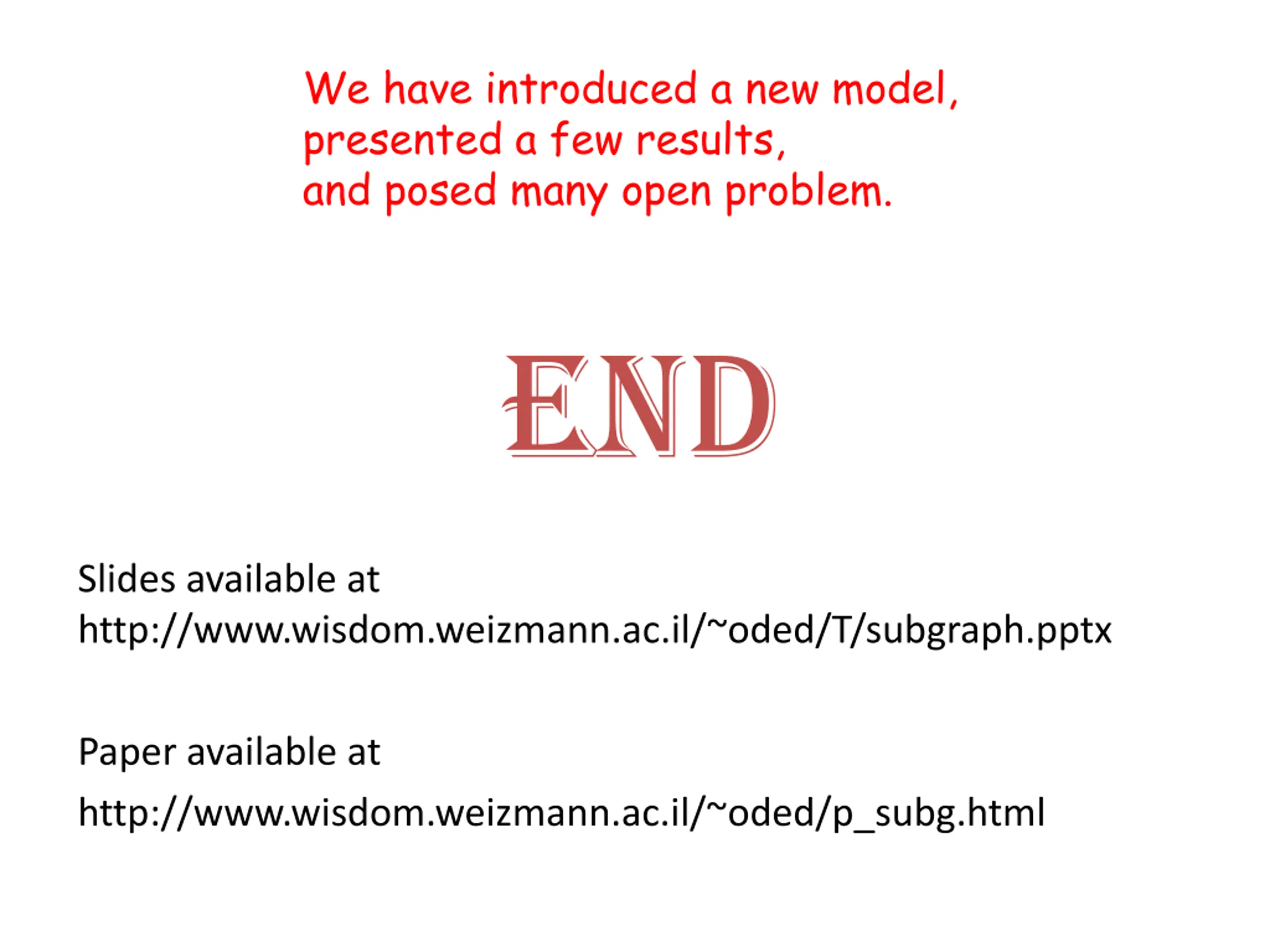 We have introduced a new model, presented a few results, and posed many open problem. END Slides available at http://www.wisdom.weizmann.ac.il/~oded/T/subgraph.pptx Paper available at http://www.wisdom.weizmann.ac.il/~oded/p_subg.html