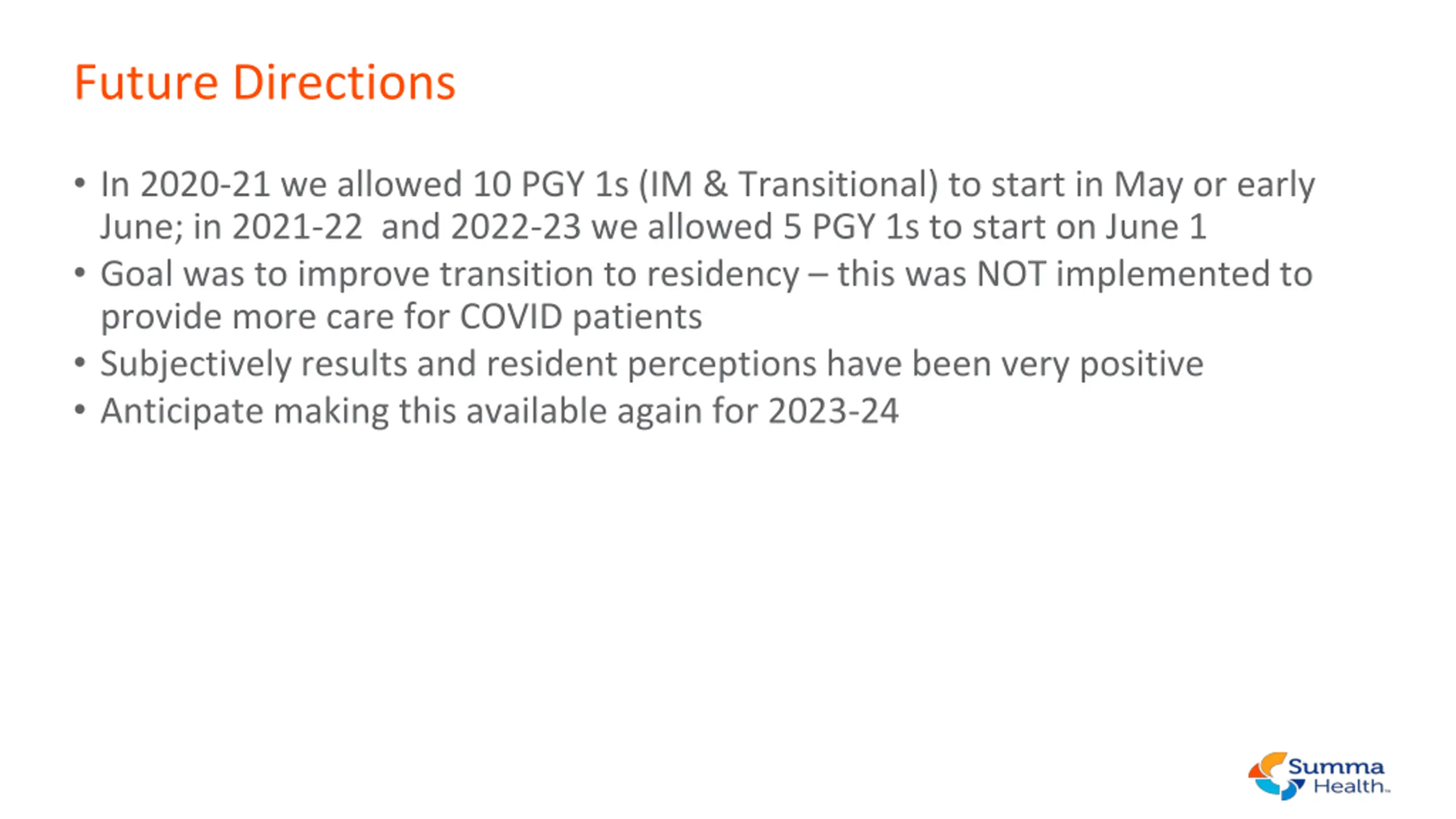Future Directions In 2020-21 we allowed 10 PGY 1s (IM & Transitional) to start in May or early June; in 2021-22 and 2022-23 we allowed 5 PGY 1s to start on June 1 Goal was to improve transition to residency this was NOT implemented to provide more care for COVID patients Subjectively results and resident perceptions have been very positive Anticipate making this available again for 2023-24