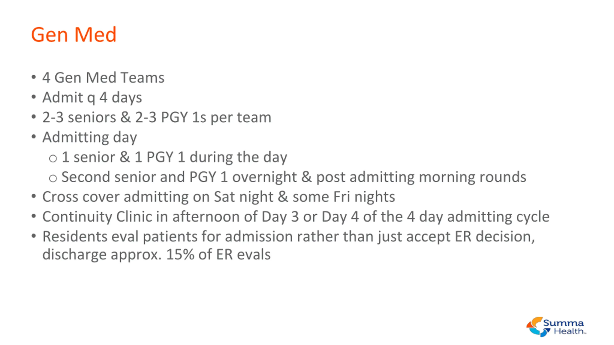 Gen Med 4 Gen Med Teams Admit q 4 days 2-3 seniors & 2-3 PGY 1s per team Admitting day o 1 senior & 1 PGY 1 during the day o Second senior and PGY 1 overnight & post admitting morning rounds Cross cover admitting on Sat night & some Fri nights Continuity Clinic in afternoon of Day 3 or Day 4 of the 4 day admitting cycle Residents eval patients for admission rather than just accept ER decision, discharge approx. 15% of ER evals