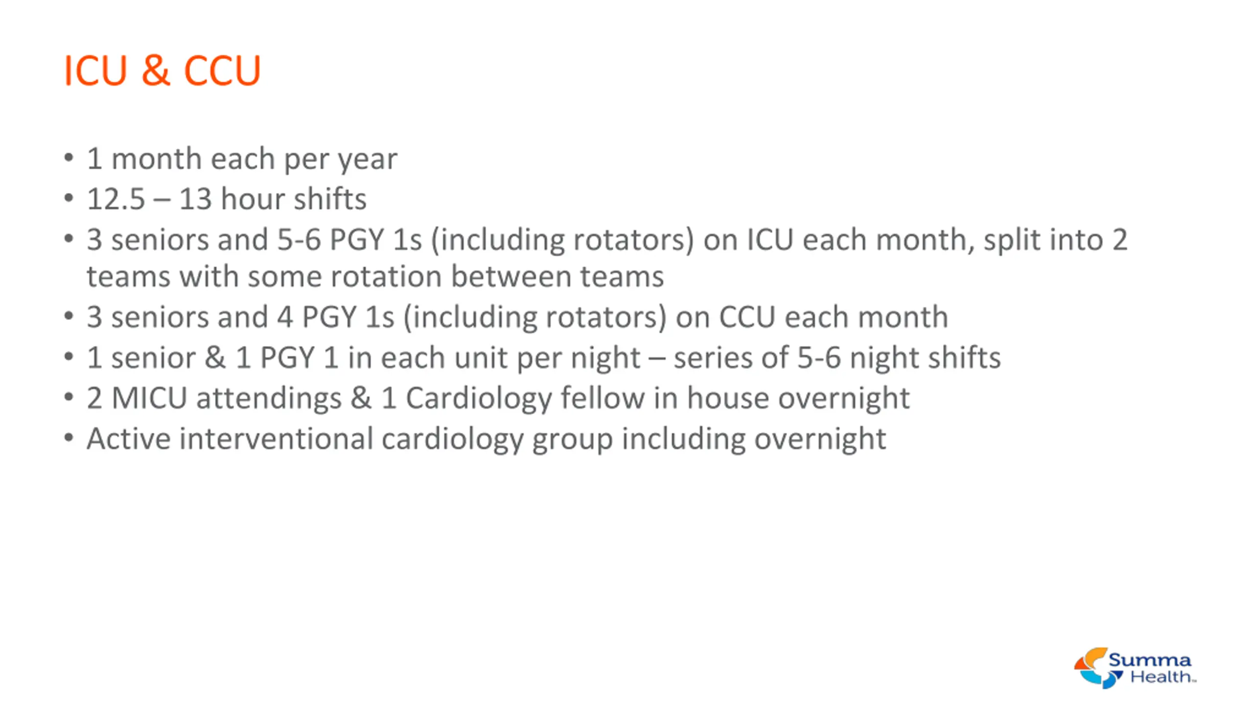 ICU & CCU 1 month each per year 12.5 13 hour shifts 3 seniors and 5-6 PGY 1s (including rotators) on ICU each month, split into 2 teams with some rotation between teams 3 seniors and 4 PGY 1s (including rotators) on CCU each month 1 senior & 1 PGY 1 in each unit per night series of 5-6 night shifts 2 MICU attendings & 1 Cardiology fellow in house overnight Active interventional cardiology group including overnight