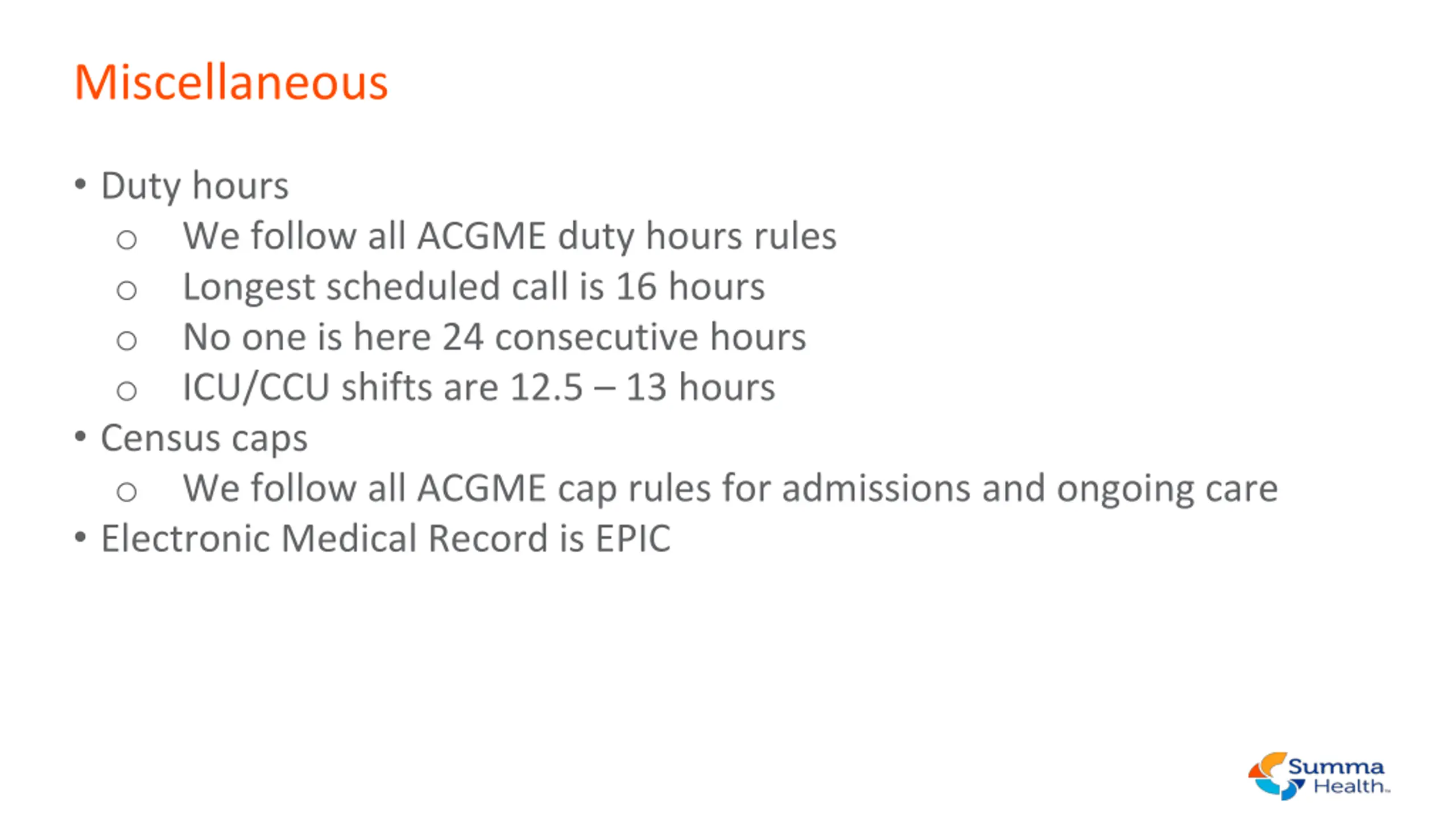Miscellaneous Duty hours o o o o Census caps o We follow all ACGME cap rules for admissions and ongoing care Electronic Medical Record is EPIC We follow all ACGME duty hours rules Longest scheduled call is 16 hours No one is here 24 consecutive hours ICU/CCU shifts are 12.5 13 hours