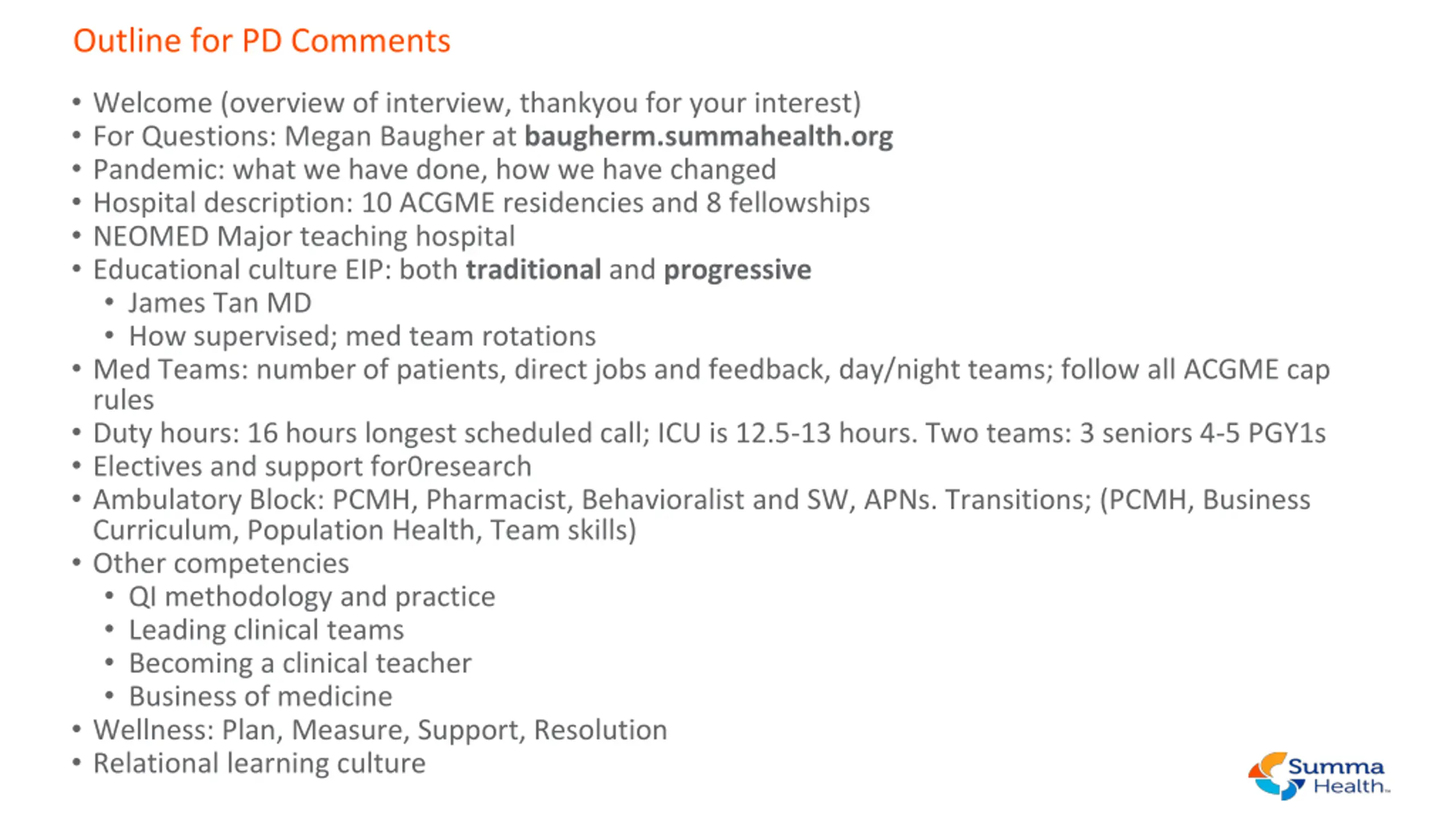 Outline for PD Comments Welcome (overview of interview, thankyou for your interest) For Questions: Megan Baugher at baugherm.summahealth.org Pandemic: what we have done, how we have changed Hospital description: 10 ACGME residencies and 8 fellowships NEOMED Major teaching hospital Educational culture EIP: both traditional and progressive James Tan MD How supervised; med team rotations Med Teams: number of patients, direct jobs and feedback, day/night teams; follow all ACGME cap rules Duty hours: 16 hours longest scheduled call; ICU is 12.5-13 hours. Two teams: 3 seniors 4-5 PGY1s Electives and support for0research Ambulatory Block: PCMH, Pharmacist, Behavioralist and SW, APNs. Transitions; (PCMH, Business Curriculum, Population Health, Team skills) Other competencies QI methodology and practice Leading clinical teams Becoming a clinical teacher Business of medicine Wellness: Plan, Measure, Support, Resolution Relational learning culture