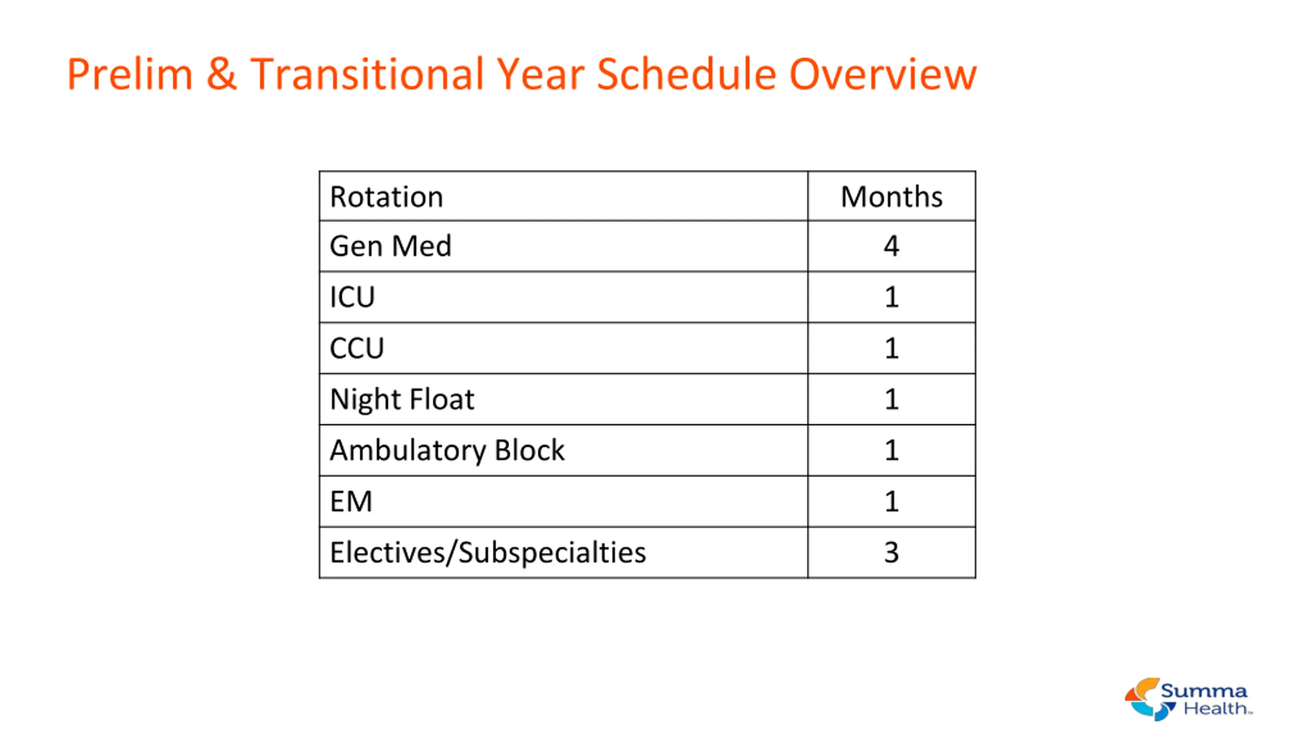 Prelim & Transitional Year Schedule Overview Rotation Months Gen Med 4 ICU 1 CCU 1 Night Float 1 Ambulatory Block 1 EM 1 Electives/Subspecialties 3