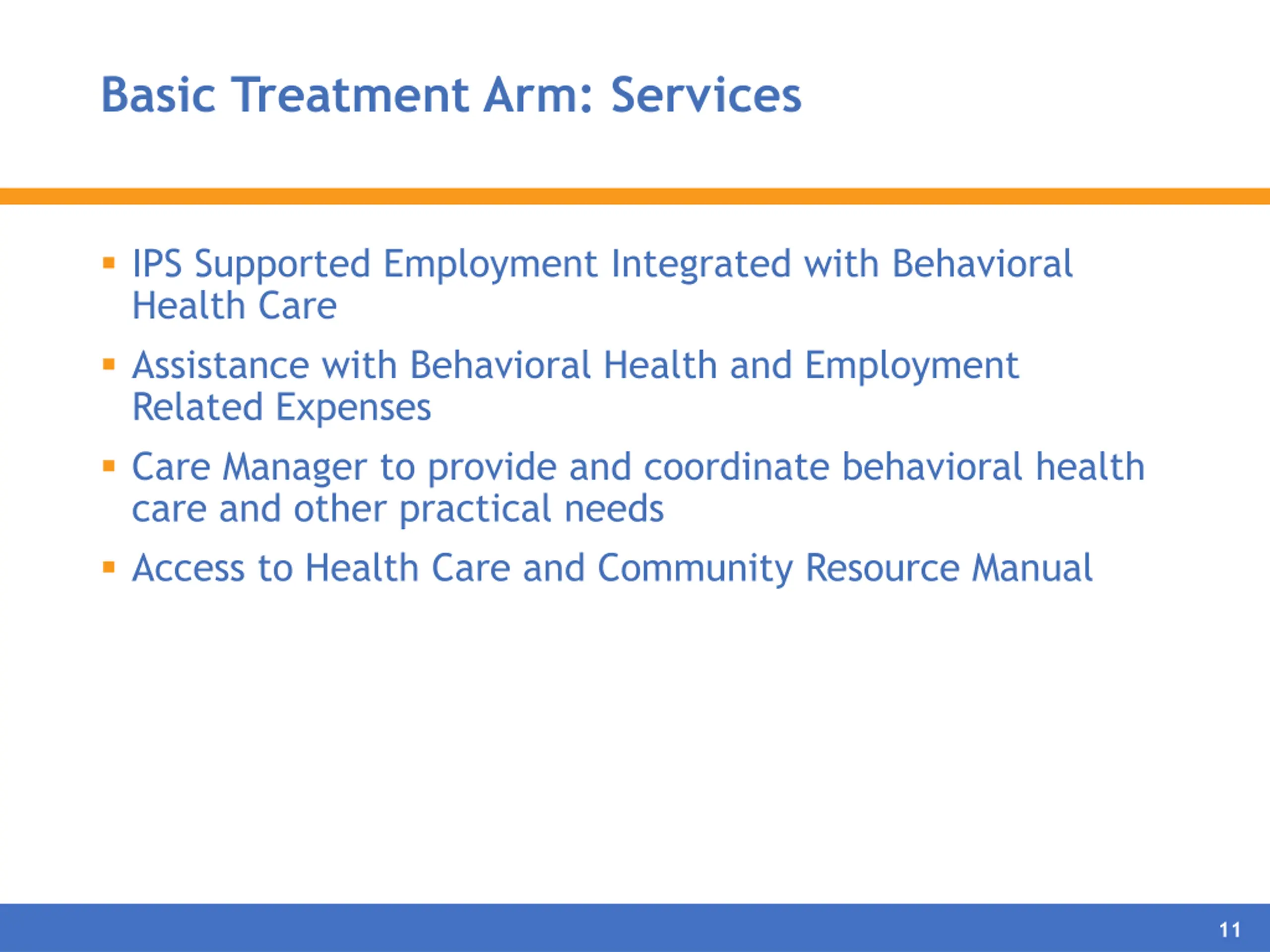 Basic Treatment Arm: Services IPS Supported Employment Integrated with Behavioral Health Care Assistance with Behavioral Health and Employment Related Expenses Care Manager to provide and coordinate behavioral health care and other practical needs Access to Health Care and Community Resource Manual 11