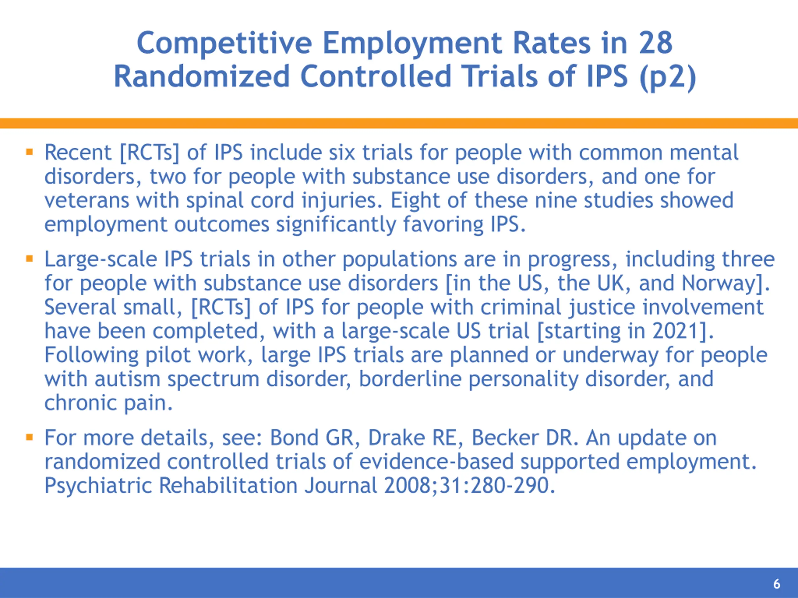 Competitive Employment Rates in 28 Randomized Controlled Trials of IPS (p2) Recent [RCTs] of IPS include six trials for people with common mental disorders, two for people with substance use disorders, and one for veterans with spinal cord injuries. Eight of these nine studies showed employment outcomes significantly favoring IPS. Large-scale IPS trials in other populations are in progress, including three for people with substance use disorders [in the US, the UK, and Norway]. Several small, [RCTs] of IPS for people with criminal justice involvement have been completed, with a large-scale US trial [starting in 2021]. Following pilot work, large IPS trials are planned or underway for people with autism spectrum disorder, borderline personality disorder, and chronic pain. For more details, see: Bond GR, Drake RE, Becker DR. An update on randomized controlled trials of evidence-based supported employment. Psychiatric Rehabilitation Journal 2008;31:280-290. 6