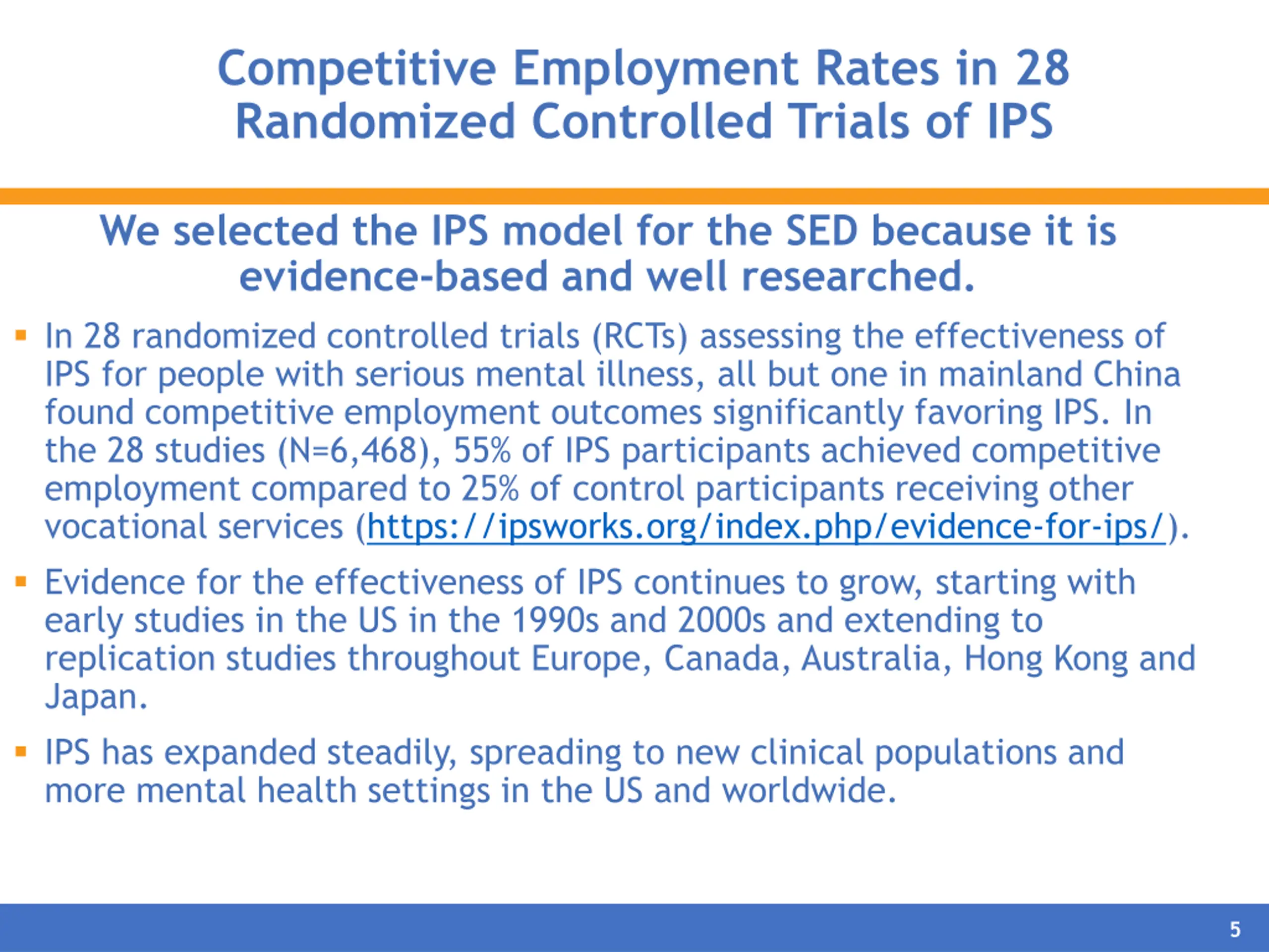 Competitive Employment Rates in 28 Randomized Controlled Trials of IPS We selected the IPS model for the SED because it is evidence-based and well researched. In 28 randomized controlled trials (RCTs) assessing the effectiveness of IPS for people with serious mental illness, all but one in mainland China found competitive employment outcomes significantly favoring IPS. In the 28 studies (N=6,468), 55% of IPS participants achieved competitive employment compared to 25% of control participants receiving other vocational services (https://ipsworks.org/index.php/evidence-for-ips/). Evidence for the effectiveness of IPS continues to grow, starting with early studies in the US in the 1990s and 2000s and extending to replication studies throughout Europe, Canada, Australia, Hong Kong and Japan. IPS has expanded steadily, spreading to new clinical populations and more mental health settings in the US and worldwide. 5