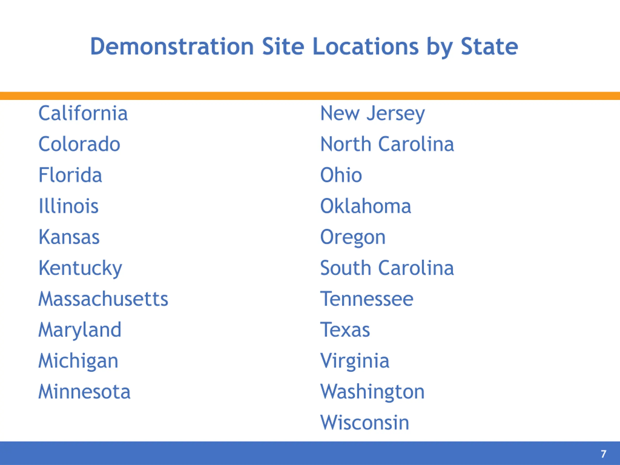 Demonstration Site Locations by State California Colorado Florida Illinois Kansas Kentucky Massachusetts Maryland Michigan Minnesota New Jersey North Carolina Ohio Oklahoma Oregon South Carolina Tennessee Texas Virginia Washington Wisconsin 7