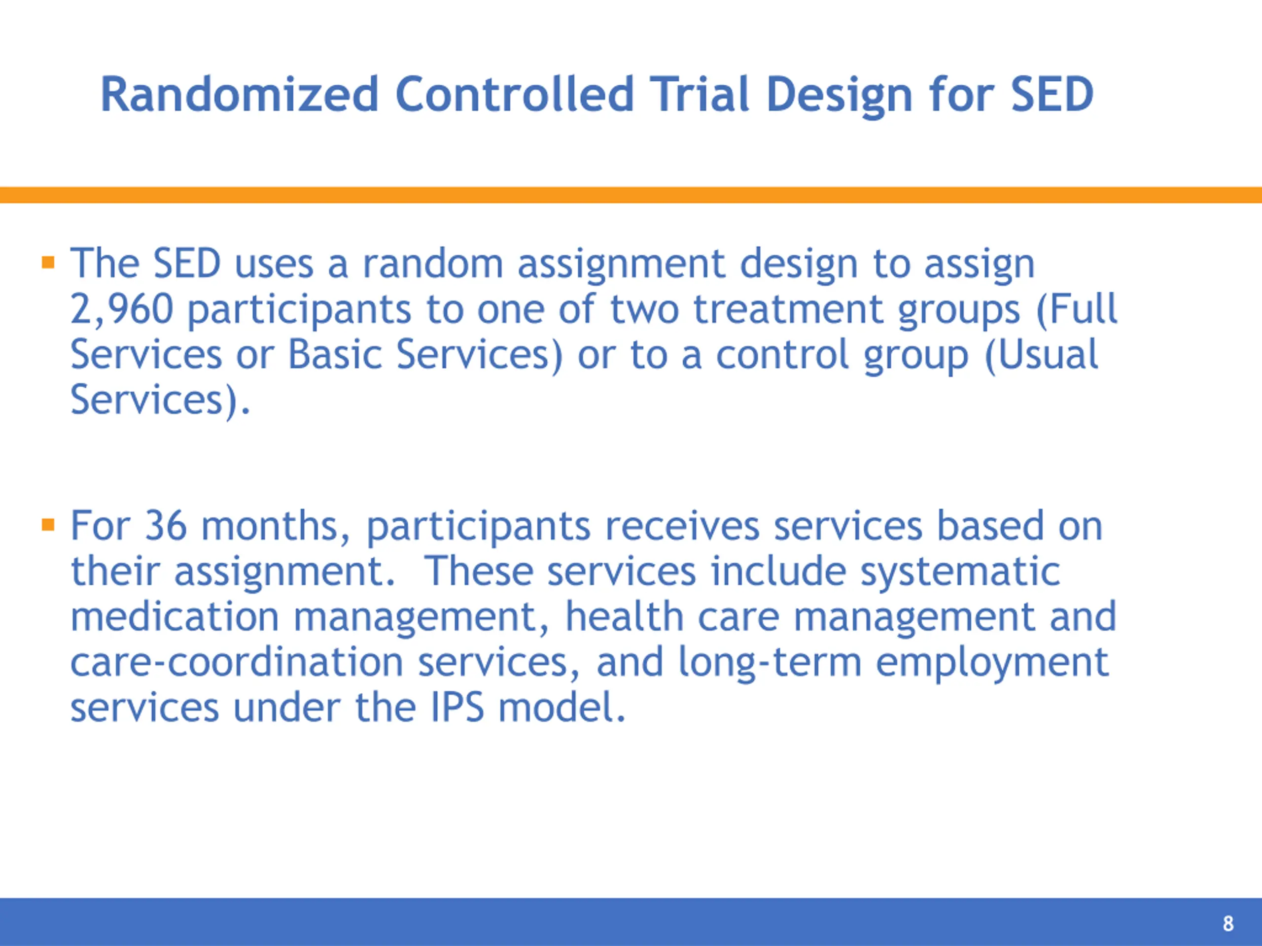 Randomized Controlled Trial Design for SED The SED uses a random assignment design to assign 2,960 participants to one of two treatment groups (Full Services or Basic Services) or to a control group (Usual Services). For 36 months, participants receives services based on their assignment. These services include systematic medication management, health care management and care-coordination services, and long-term employment services under the IPS model. 8