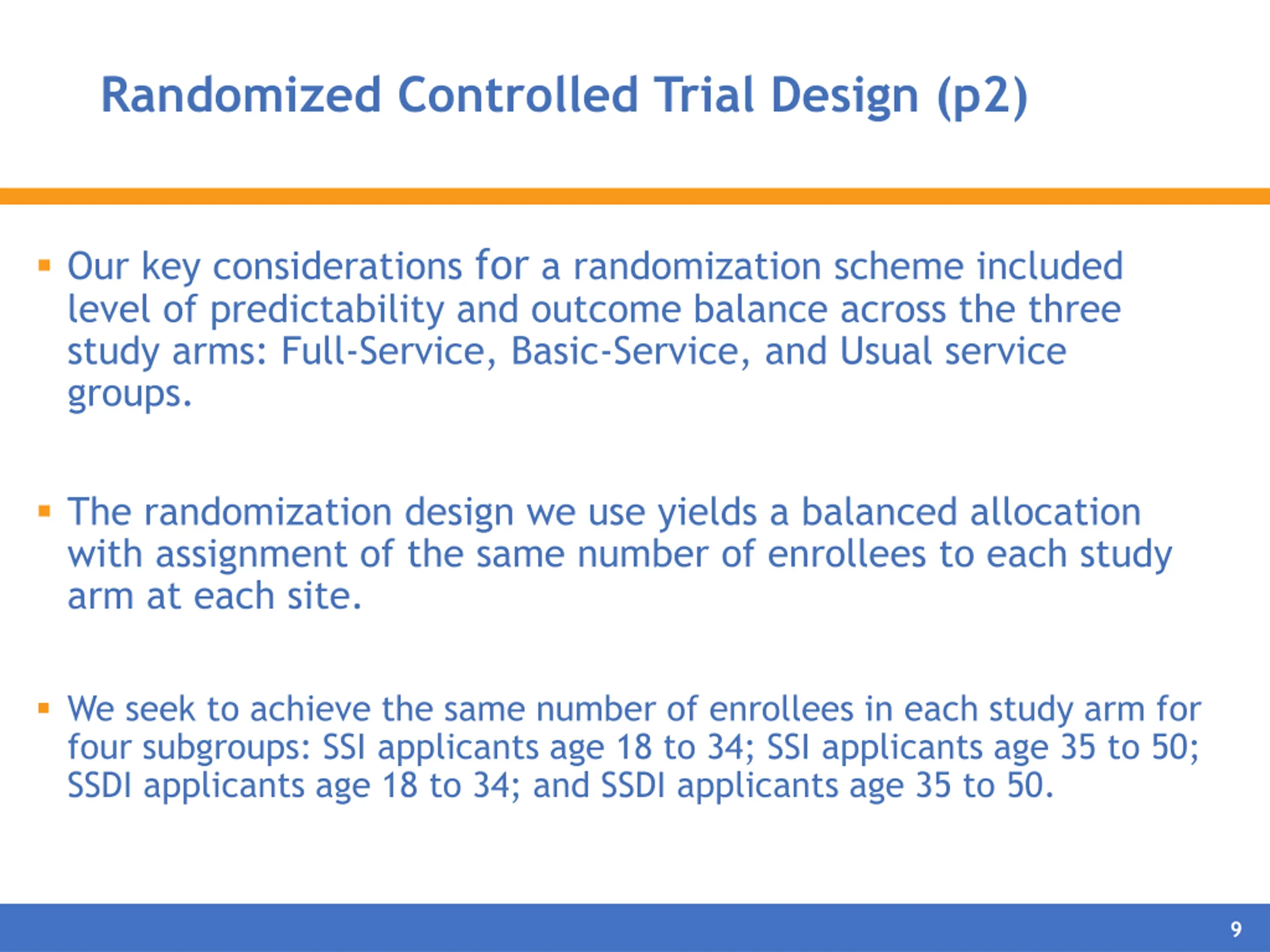 Randomized Controlled Trial Design (p2) Our key considerations for a randomization scheme included level of predictability and outcome balance across the three study arms: Full-Service, Basic-Service, and Usual service groups. The randomization design we use yields a balanced allocation with assignment of the same number of enrollees to each study arm at each site. We seek to achieve the same number of enrollees in each study arm for four subgroups: SSI applicants age 18 to 34; SSI applicants age 35 to 50; SSDI applicants age 18 to 34; and SSDI applicants age 35 to 50. 9