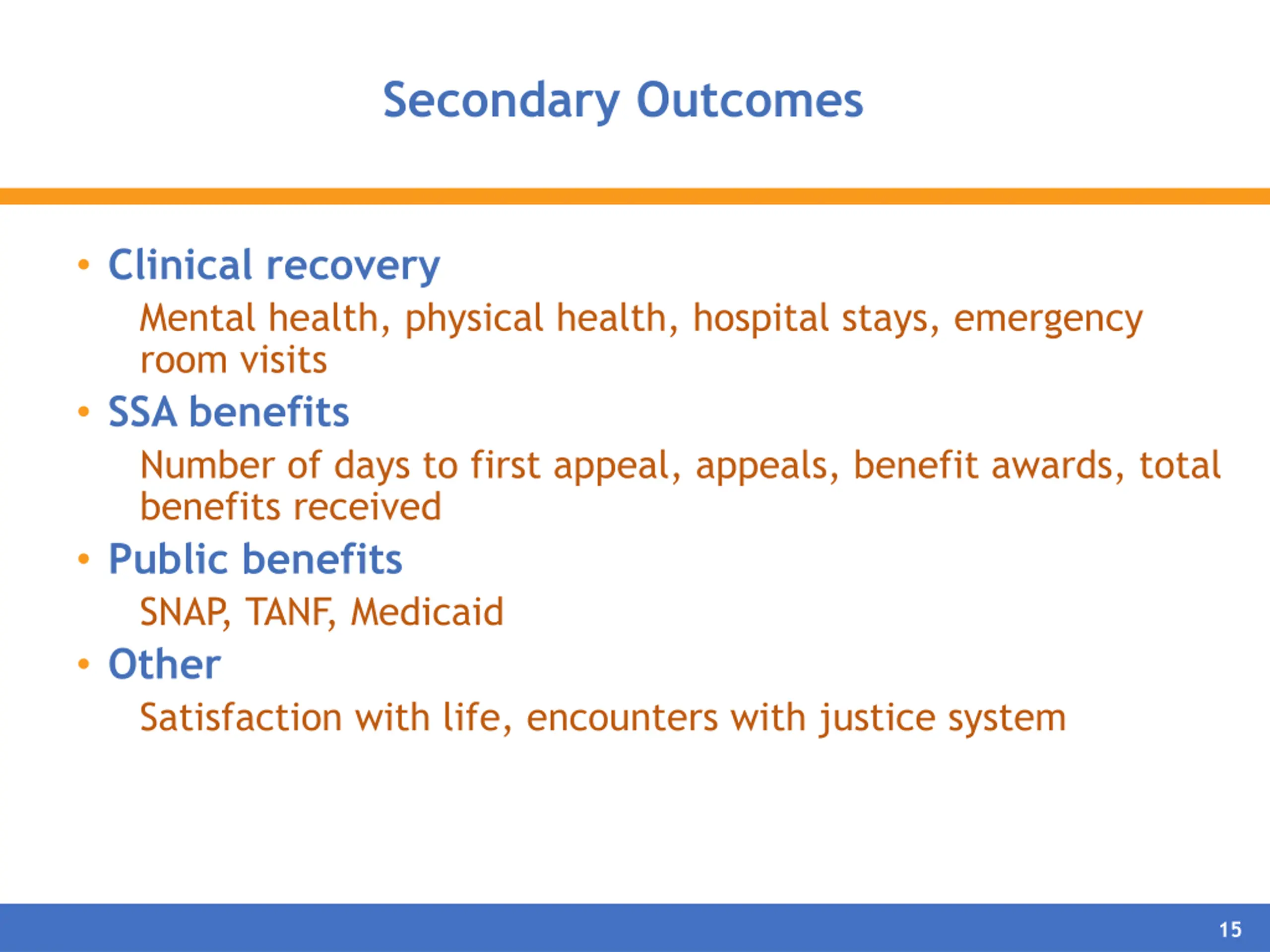Secondary Outcomes Clinical recovery Mental health, physical health, hospital stays, emergency room visits SSA benefits Number of days to first appeal, appeals, benefit awards, total benefits received Public benefits SNAP, TANF, Medicaid Other Satisfaction with life, encounters with justice system 15