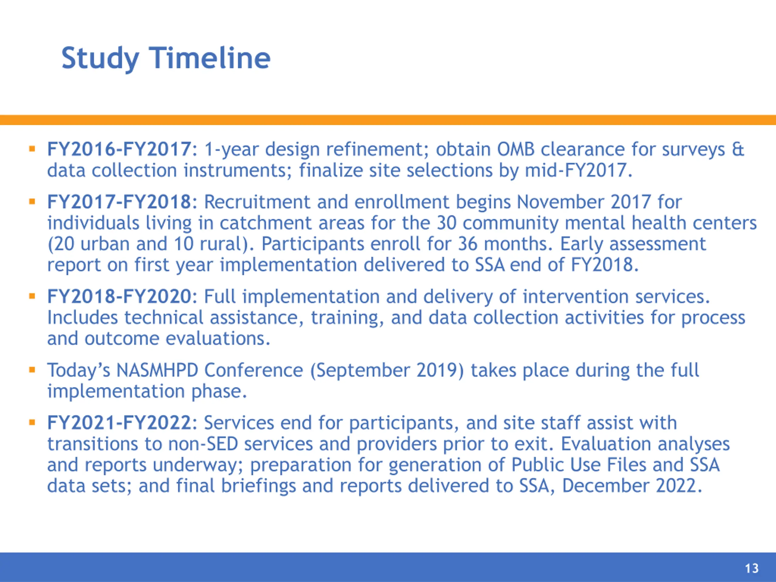 Study Timeline FY2016-FY2017: 1-year design refinement; obtain OMB clearance for surveys & data collection instruments; finalize site selections by mid-FY2017. FY2017-FY2018: Recruitment and enrollment begins November 2017 for individuals living in catchment areas for the 30 community mental health centers (20 urban and 10 rural). Participants enroll for 36 months. Early assessment report on first year implementation delivered to SSA end of FY2018. FY2018-FY2020: Full implementation and delivery of intervention services. Includes technical assistance, training, and data collection activities for process and outcome evaluations. Today s NASMHPD Conference (September 2019) takes place during the full implementation phase. FY2021-FY2022: Services end for participants, and site staff assist with transitions to non-SED services and providers prior to exit. Evaluation analyses and reports underway; preparation for generation of Public Use Files and SSA data sets; and final briefings and reports delivered to SSA, December 2022. 13