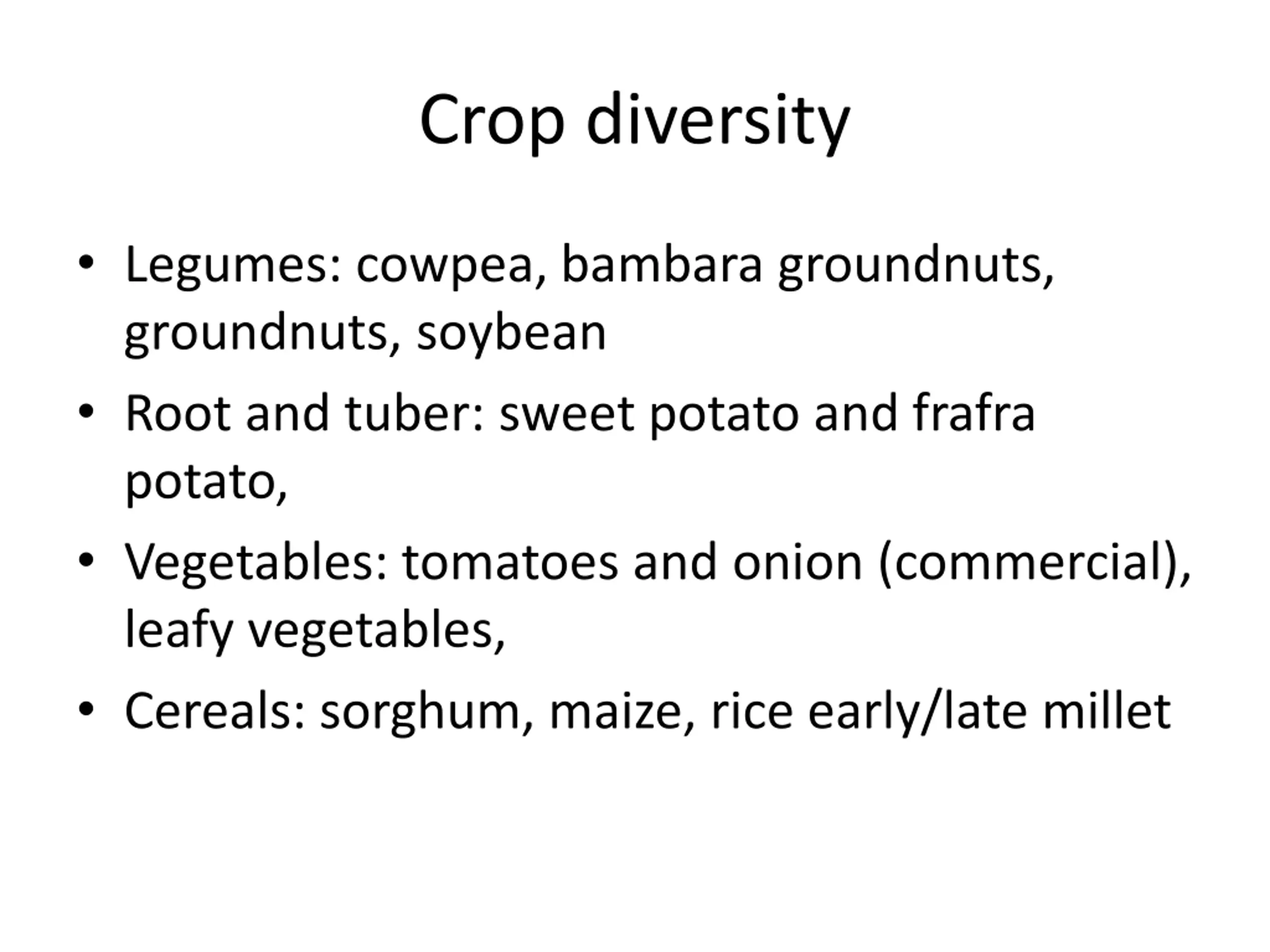 Crop diversity Legumes: cowpea, bambara groundnuts, groundnuts, soybean Root and tuber: sweet potato and frafra potato, Vegetables: tomatoes and onion (commercial), leafy vegetables, Cereals: sorghum, maize, rice early/late millet