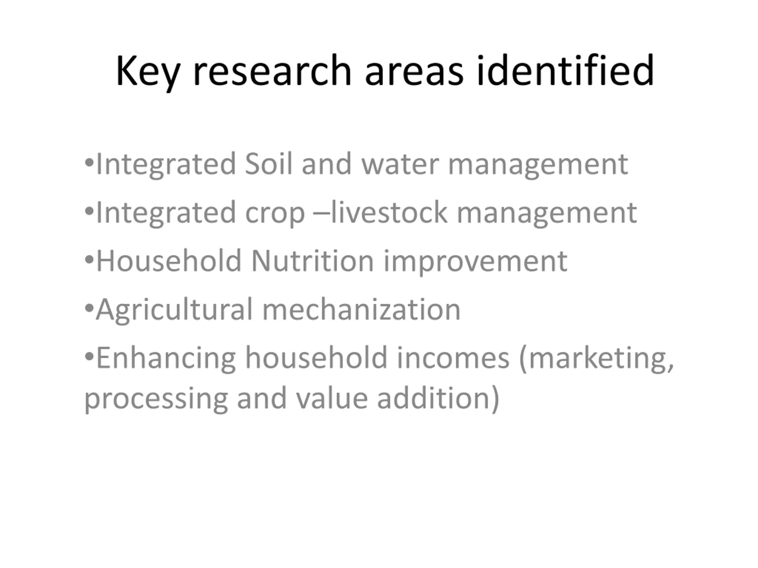 Key research areas identified Integrated Soil and water management Integrated crop livestock management Household Nutrition improvement Agricultural mechanization Enhancing household incomes (marketing, processing and value addition)