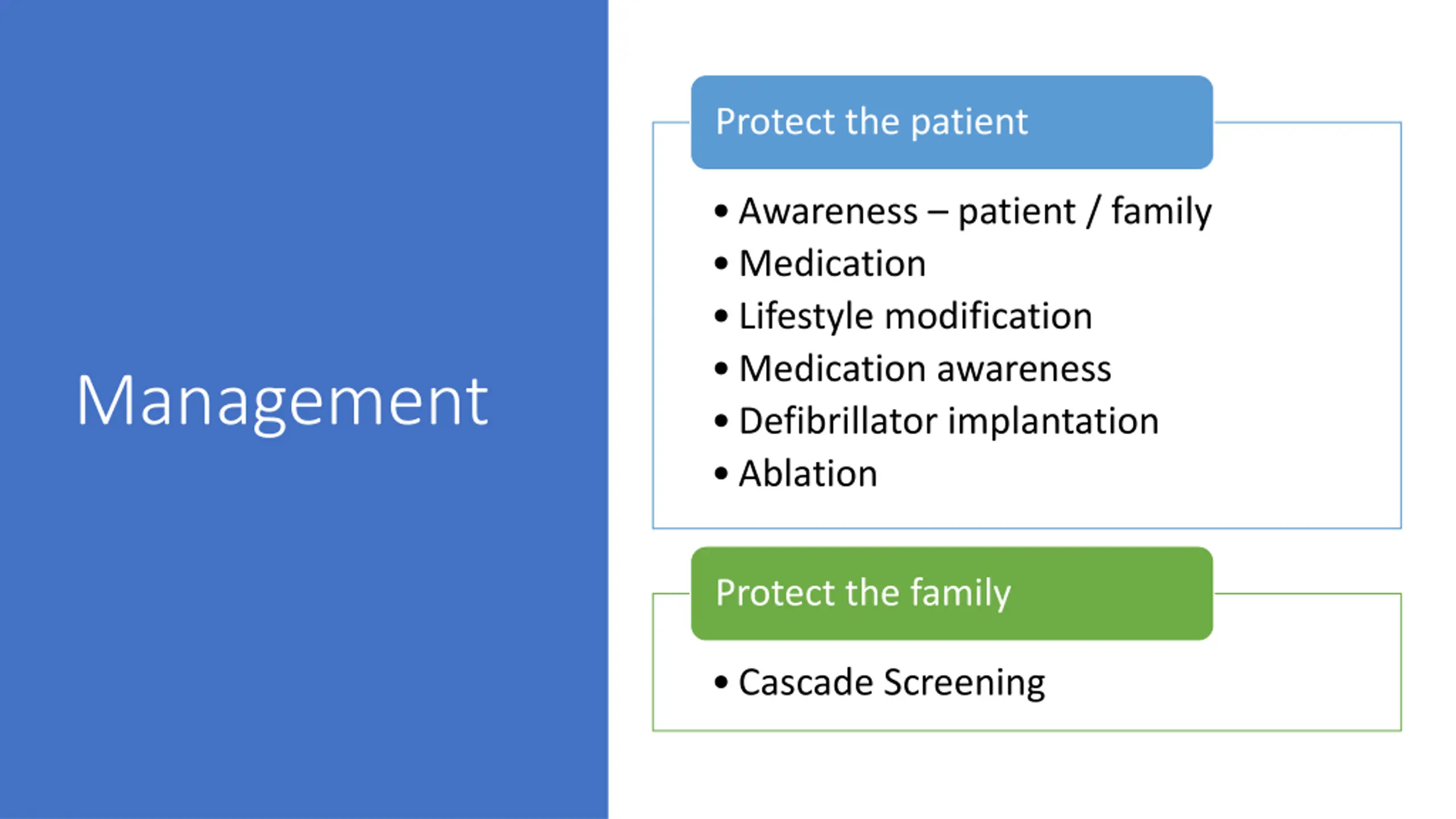 Protect the patient Awareness patient / family Medication Lifestyle modification Medication awareness Defibrillator implantation Ablation Management Protect the family Cascade Screening