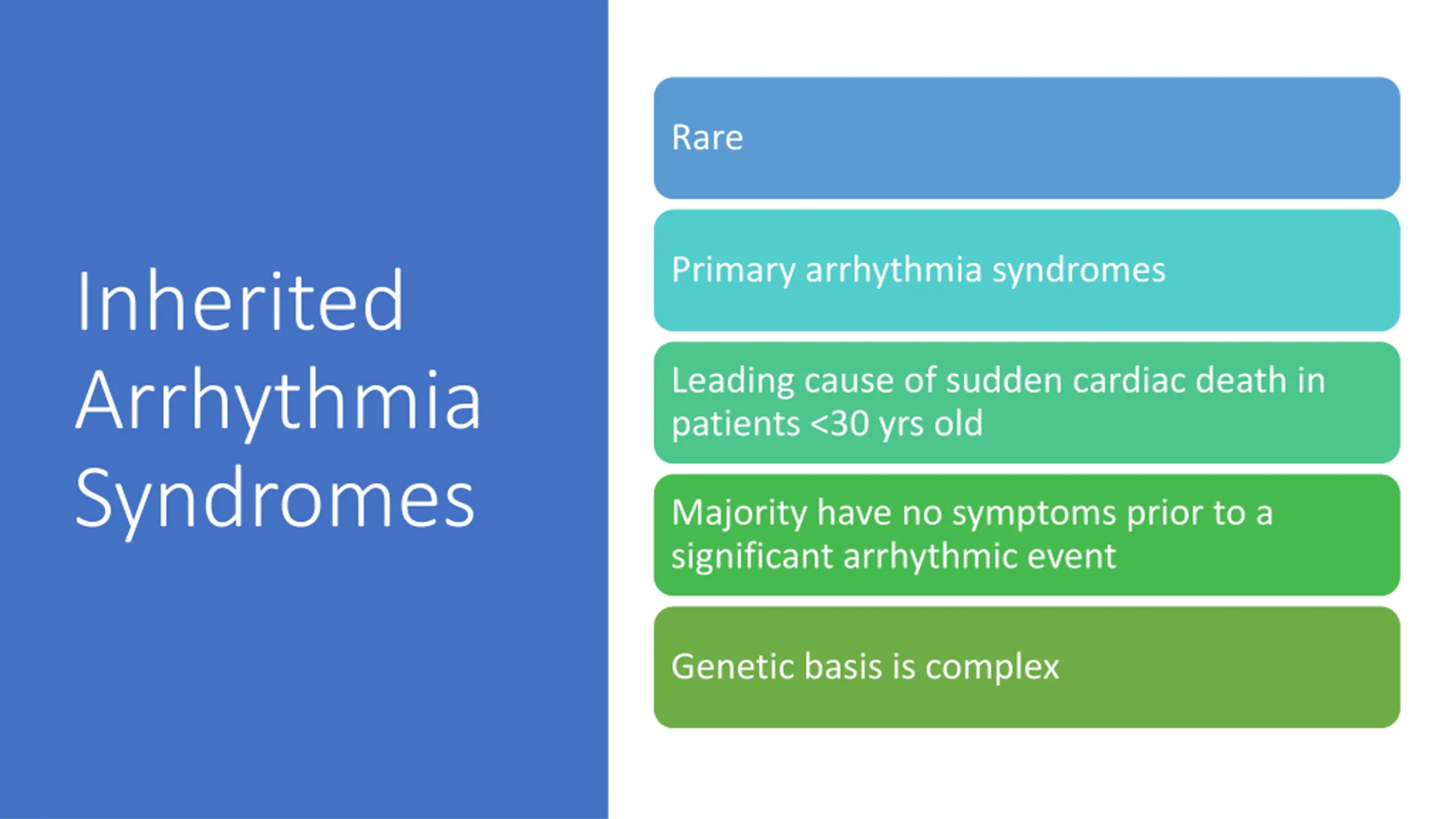 Rare Primary arrhythmia syndromes Inherited Arrhythmia Syndromes Leading cause of sudden cardiac death in patients <30 yrs old Majority have no symptoms prior to a significant arrhythmic event Genetic basis is complex