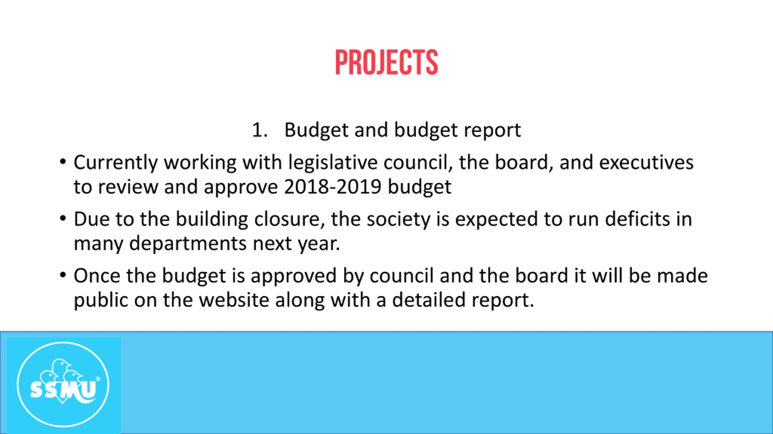 1. Budget and budget report Currently working with legislative council, the board, and executives to review and approve 2018-2019 budget Due to the building closure, the society is expected to run deficits in many departments next year. Once the budget is approved by council and the board it will be made public on the website along with a detailed report.
