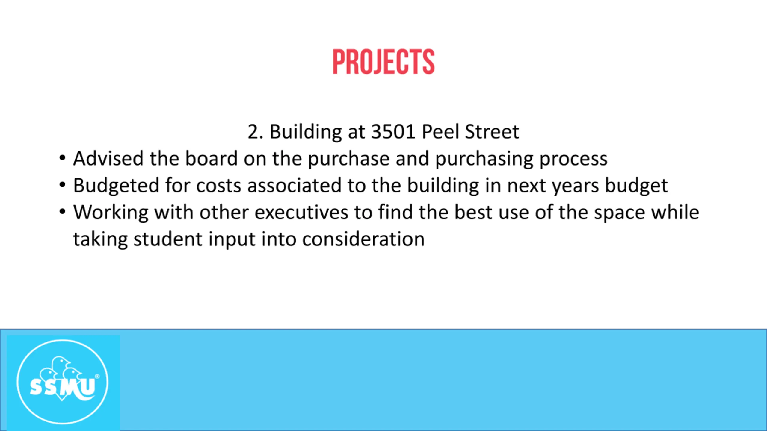 2. Building at 3501 Peel Street Advised the board on the purchase and purchasing process Budgeted for costs associated to the building in next years budget Working with other executives to find the best use of the space while taking student input into consideration