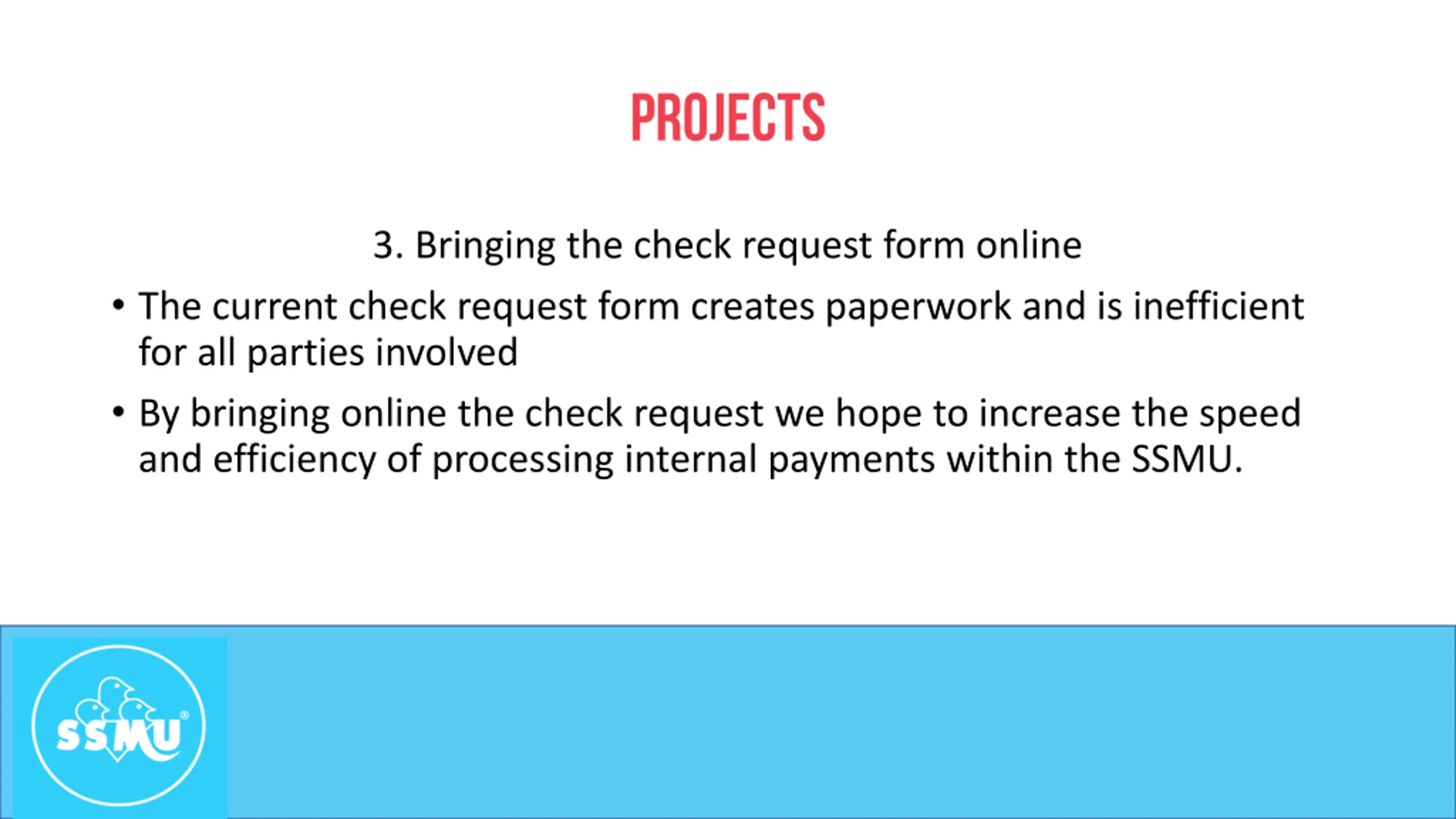 3. Bringing the check request form online The current check request form creates paperwork and is inefficient for all parties involved By bringing online the check request we hope to increase the speed and efficiency of processing internal payments within the SSMU.