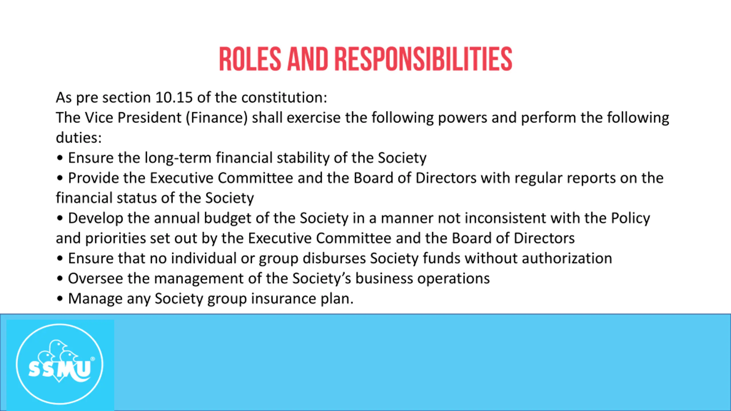 As pre section 10.15 of the constitution: The Vice President (Finance) shall exercise the following powers and perform the following duties: Ensure the long-term financial stability of the Society Provide the Executive Committee and the Board of Directors with regular reports on the financial status of the Society Develop the annual budget of the Society in a manner not inconsistent with the Policy and priorities set out by the Executive Committee and the Board of Directors Ensure that no individual or group disburses Society funds without authorization Oversee the management of the Society s business operations Manage any Society group insurance plan.
