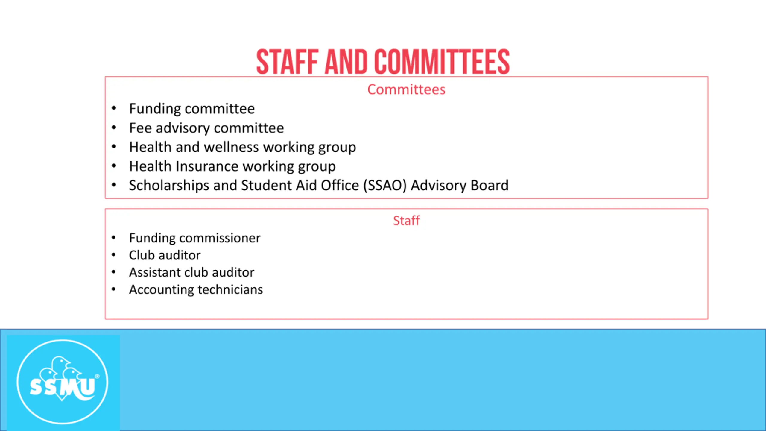 Committees Funding committee Fee advisory committee Health and wellness working group Health Insurance working group Scholarships and Student Aid Office (SSAO) Advisory Board Staff Funding commissioner Club auditor Assistant club auditor Accounting technicians