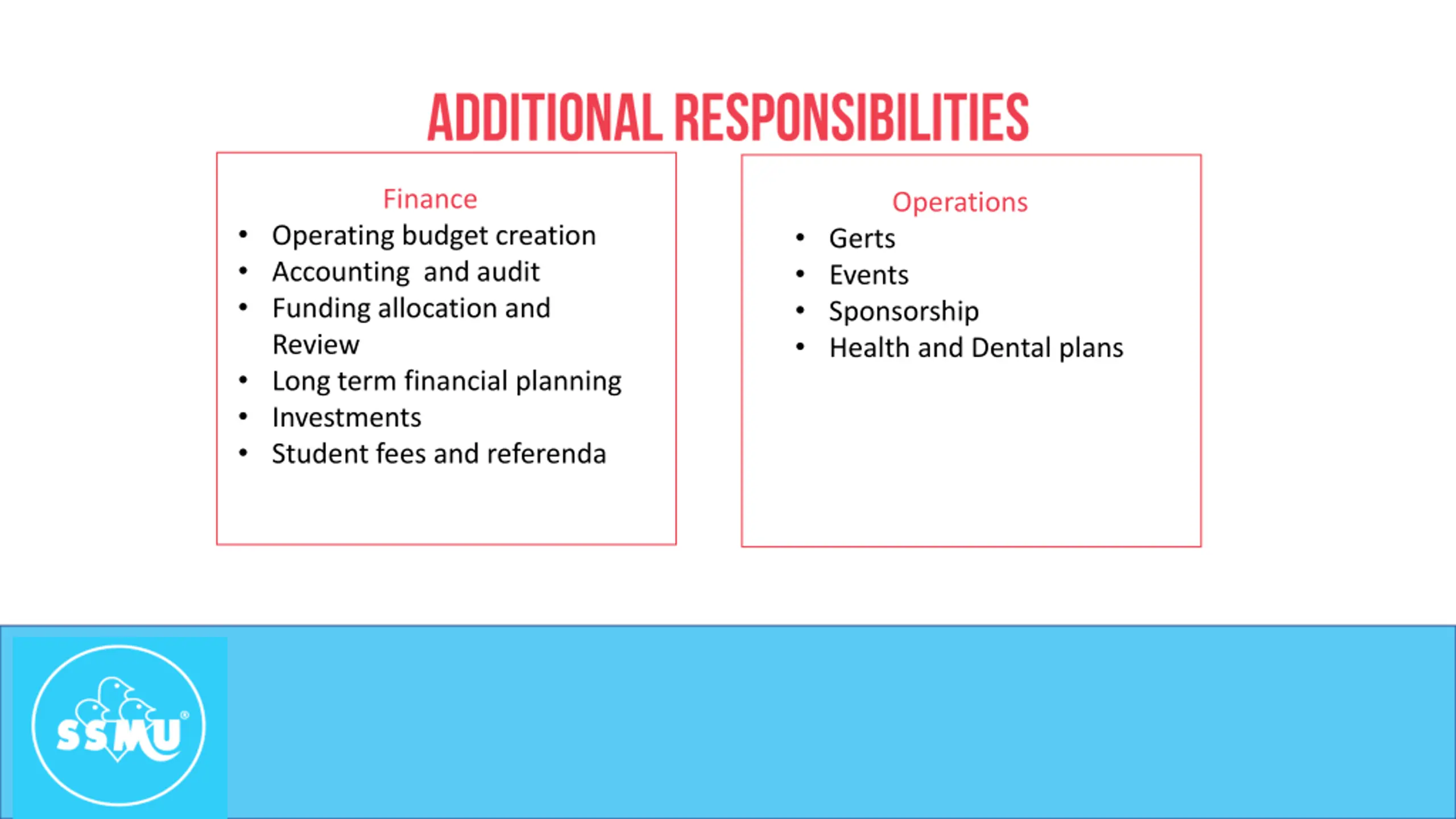 Finance Operations Operating budget creation Accounting and audit Funding allocation and Review Long term financial planning Investments Student fees and referenda Gerts Events Sponsorship Health and Dental plans
