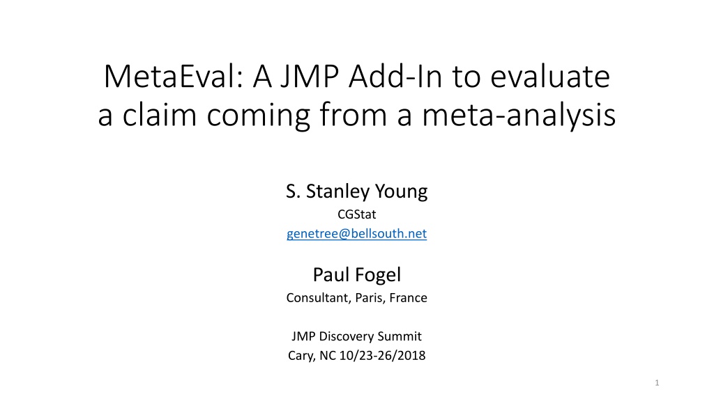 MetaEval: A JMP Add-In to evaluate a claim coming from a meta-analysis S. Stanley Young CGStat genetree@bellsouth.net Paul Fogel Consultant, Paris, France JMP Discovery Summit Cary, NC 10/23-26/2018 1