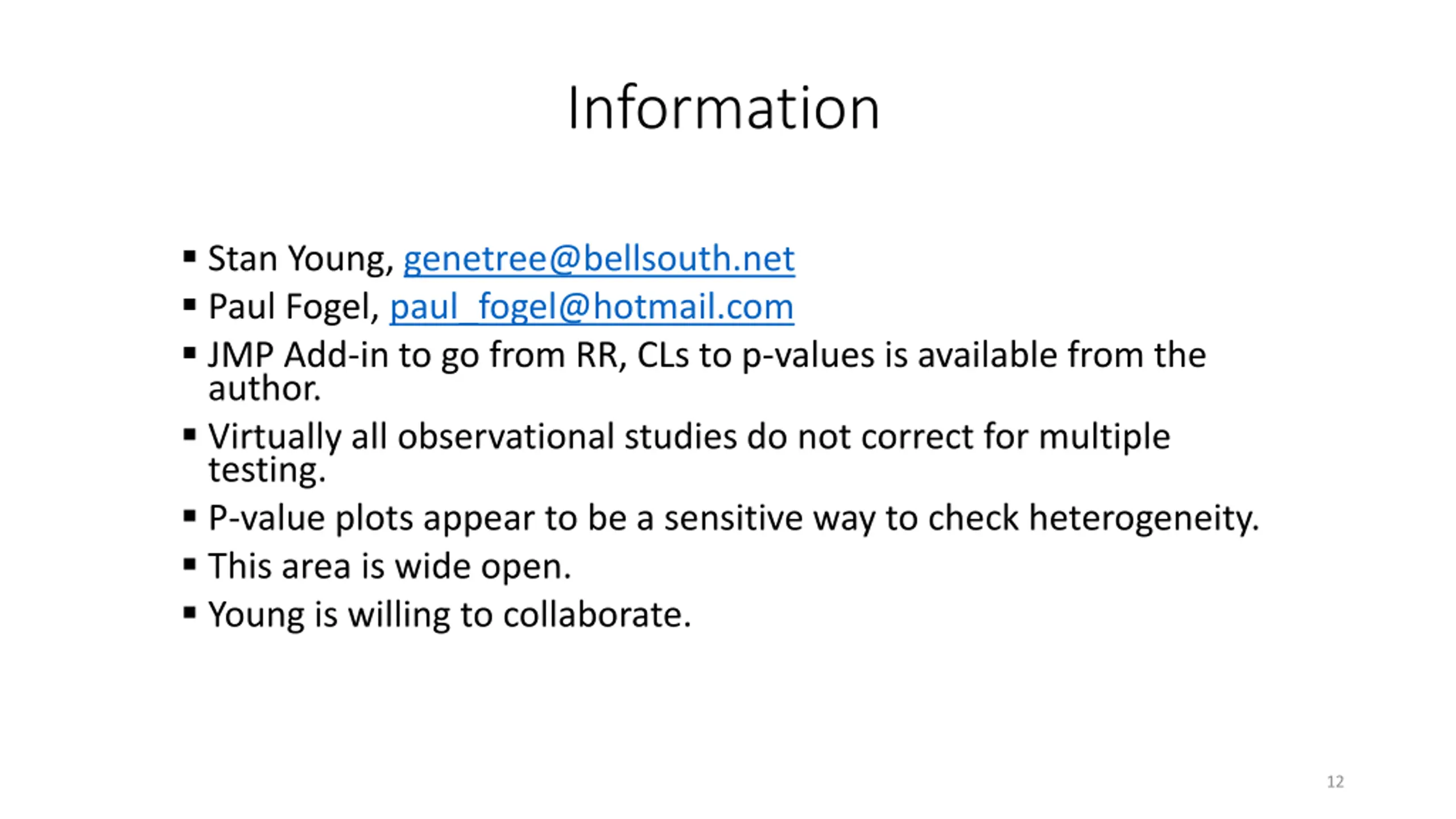 Information Stan Young, genetree@bellsouth.net Paul Fogel, paul_fogel@hotmail.com JMP Add-in to go from RR, CLs to p-values is available from the author. Virtually all observational studies do not correct for multiple testing. P-value plots appear to be a sensitive way to check heterogeneity. This area is wide open. Young is willing to collaborate. 12