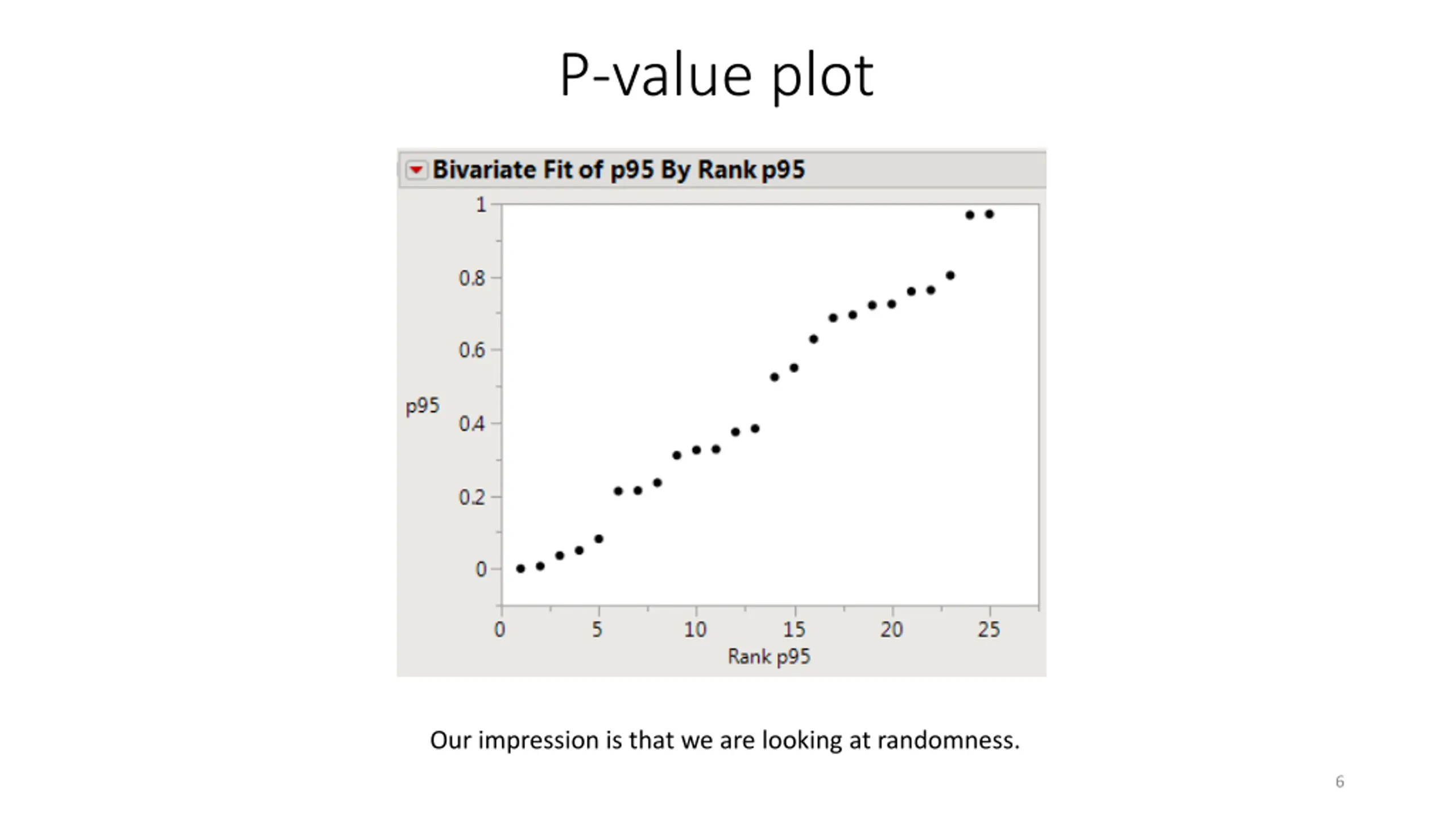 What is a p-value plot? Rank order the p-values from smallest to largest. Plot against the integers: 1, 2, 3, If you see a 45-degree line, then randomness. If you see a less than 45-degree line, then some effect. If you see bi-linear, then stop and think. 2