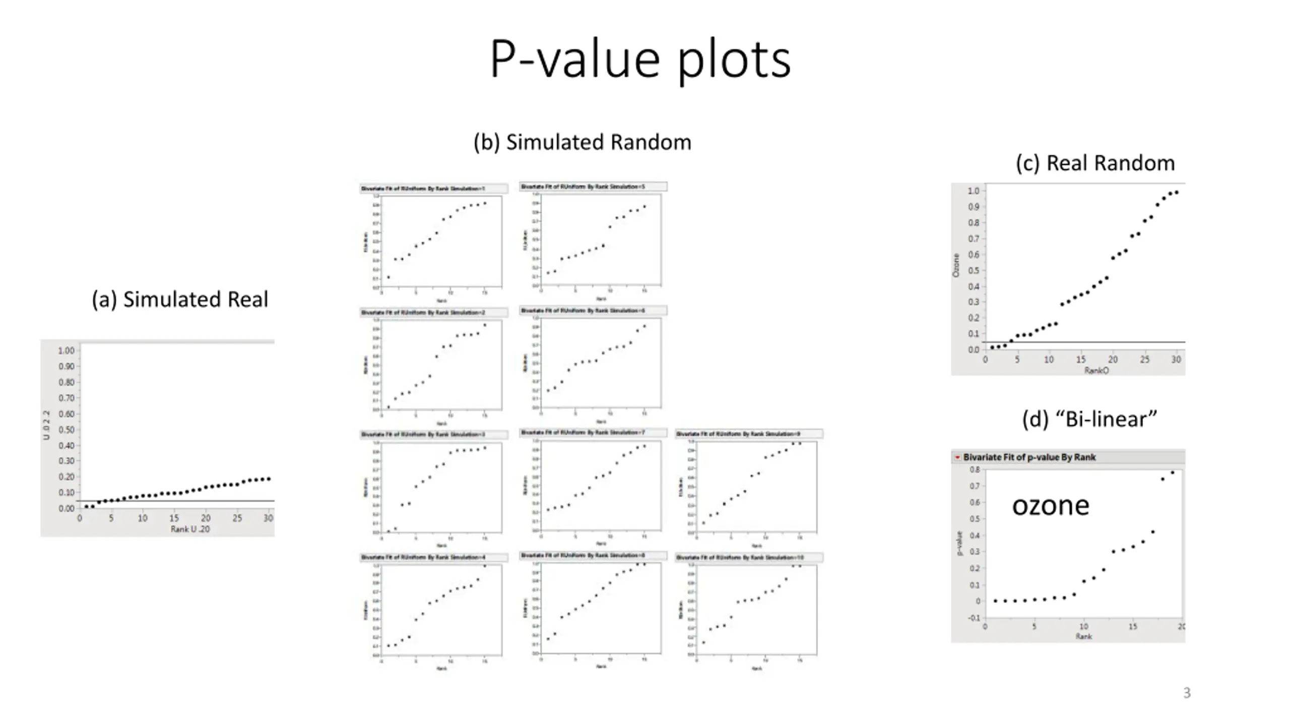 P-value plots (b) Simulated Random (c) Real Random (a) Simulated Real (d) Bi-linear ozone 3