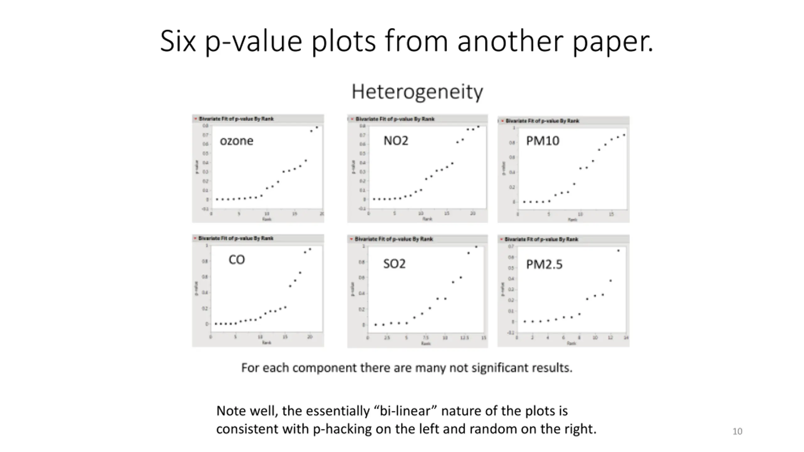 Six p-value plots from another paper. Note well, the essentially bi-linear nature of the plots is consistent with p-hacking on the left and random on the right. 10