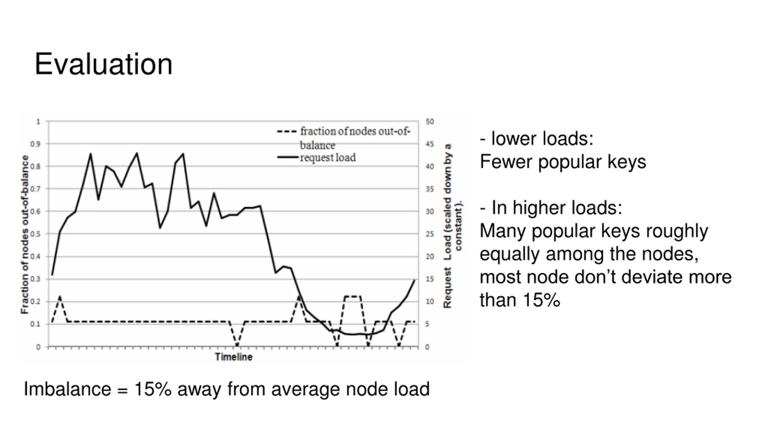 Evaluation - lower loads: Fewer popular keys - In higher loads: Many popular keys roughly equally among the nodes, most node don t deviate more than 15% Imbalance = 15% away from average node load
