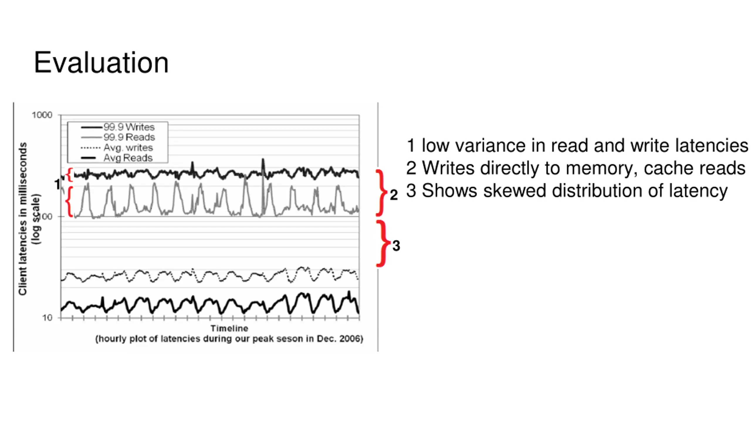 Evaluation 1 low variance in read and write latencies 2 Writes directly to memory, cache reads 3 Shows skewed distribution of latency 1 2 3
