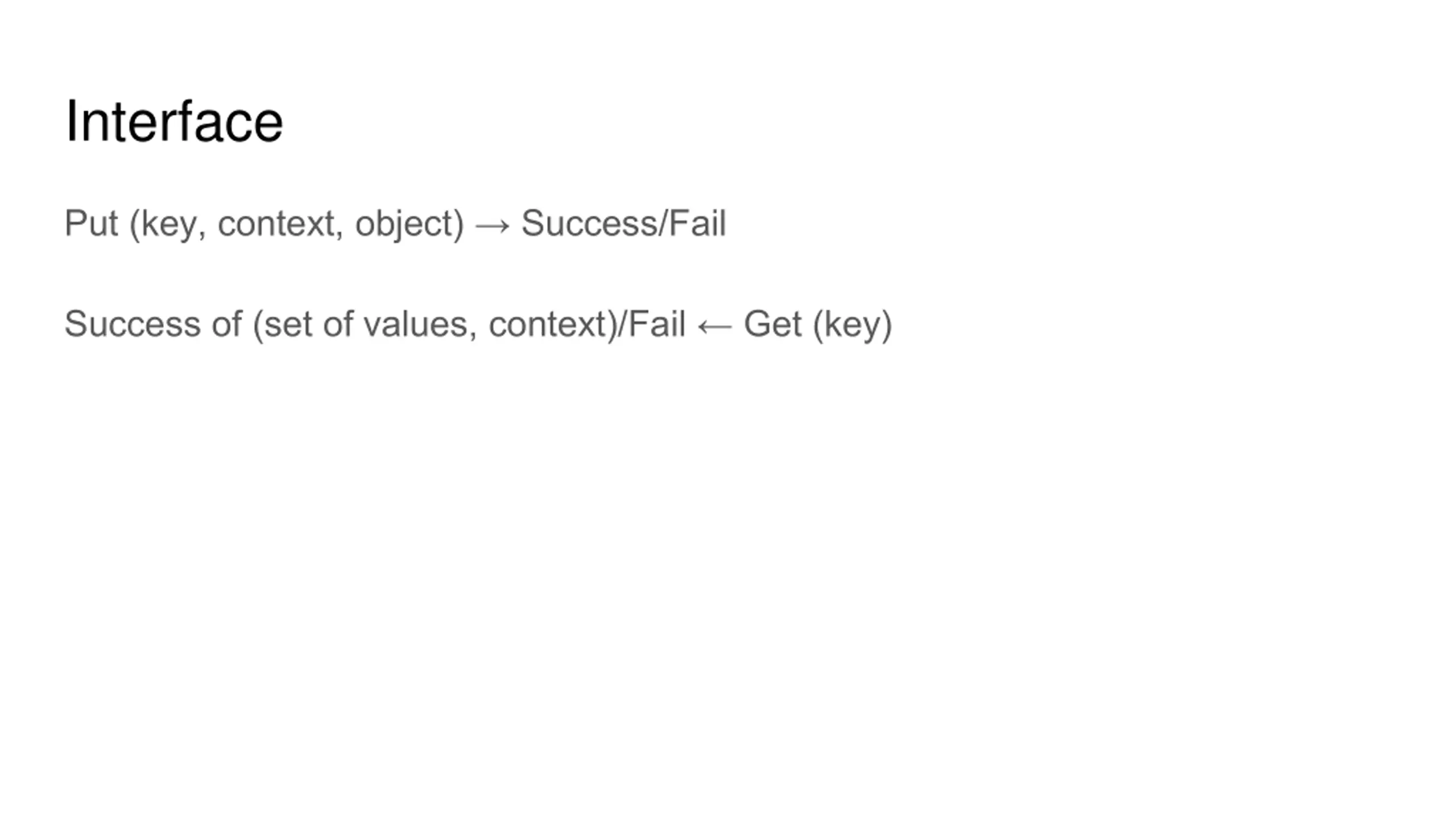 Interface Put (key, context, object) Success/Fail Success of (set of values, context)/Fail Get (key)