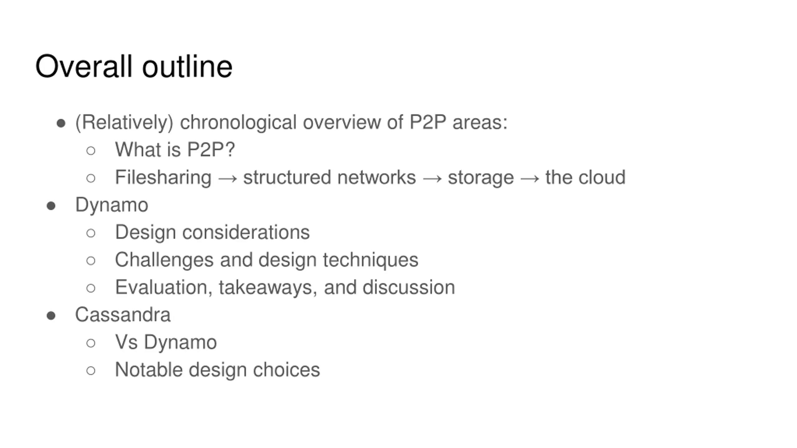 Overall outline (Relatively) chronological overview of P2P areas: What is P2P? Filesharing structured networks storage the cloud Dynamo Design considerations Challenges and design techniques Evaluation, takeaways, and discussion Cassandra Vs Dynamo Notable design choices