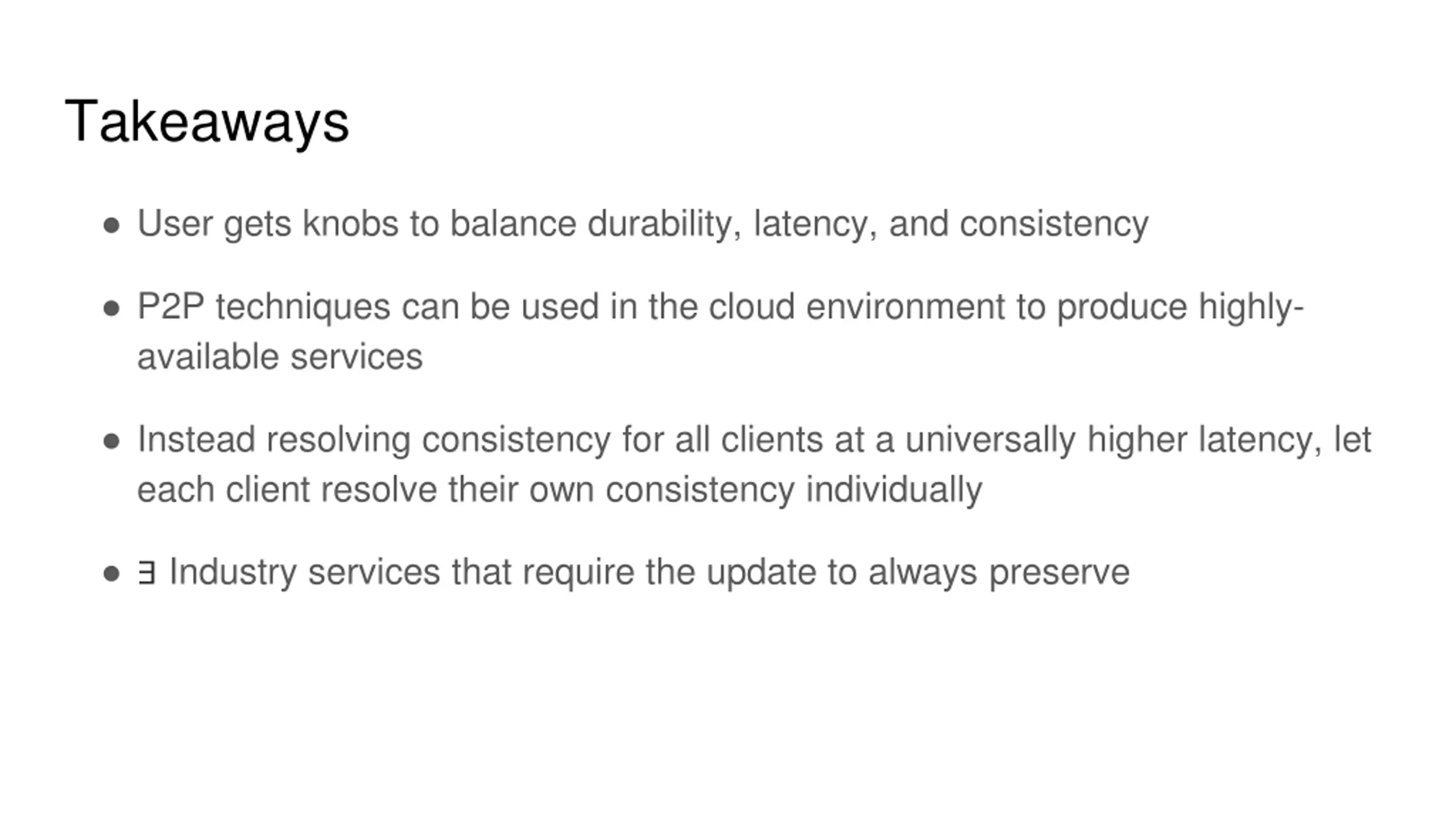 Takeaways User gets knobs to balance durability, latency, and consistency P2P techniques can be used in the cloud environment to produce highly- available services Instead resolving consistency for all clients at a universally higher latency, let each client resolve their own consistency individually Industry services that require the update to always preserve