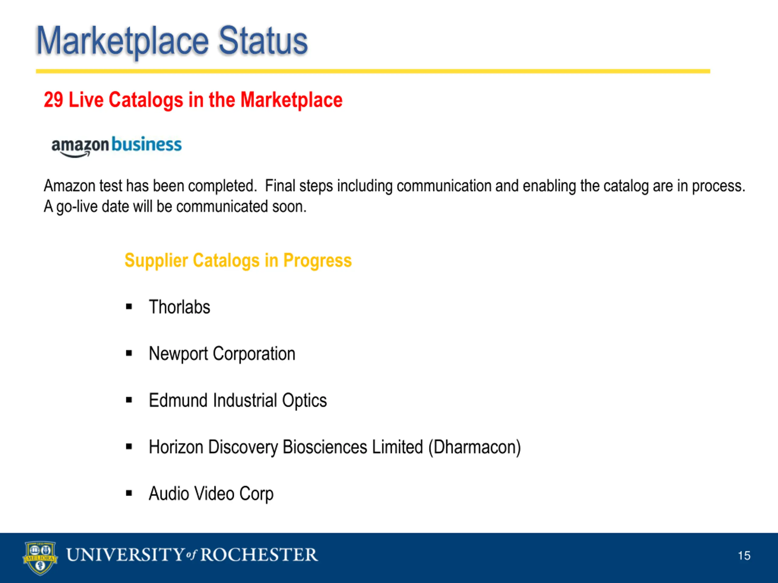 Marketplace Status 29 Live Catalogs in the Marketplace Amazon test has been completed. Final steps including communication and enabling the catalog are in process. A go-live date will be communicated soon. Supplier Catalogs in Progress Thorlabs Newport Corporation Edmund Industrial Optics Horizon Discovery Biosciences Limited (Dharmacon) Audio Video Corp 15