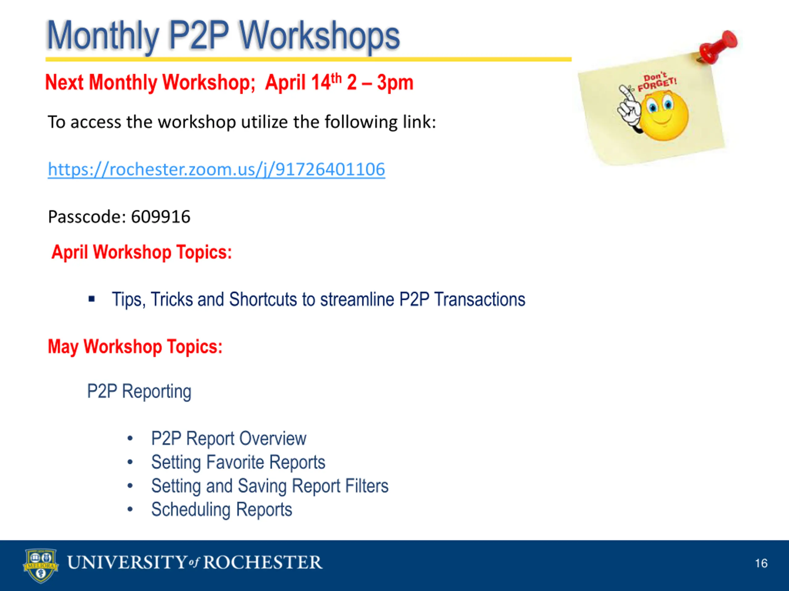 Monthly P2P Workshops Next Monthly Workshop; April 14th 2 3pm To access the workshop utilize the following link: https://rochester.zoom.us/j/91726401106 Passcode: 609916 April Workshop Topics: Tips, Tricks and Shortcuts to streamline P2P Transactions May Workshop Topics: P2P Reporting P2P Report Overview Setting Favorite Reports Setting and Saving Report Filters Scheduling Reports 16