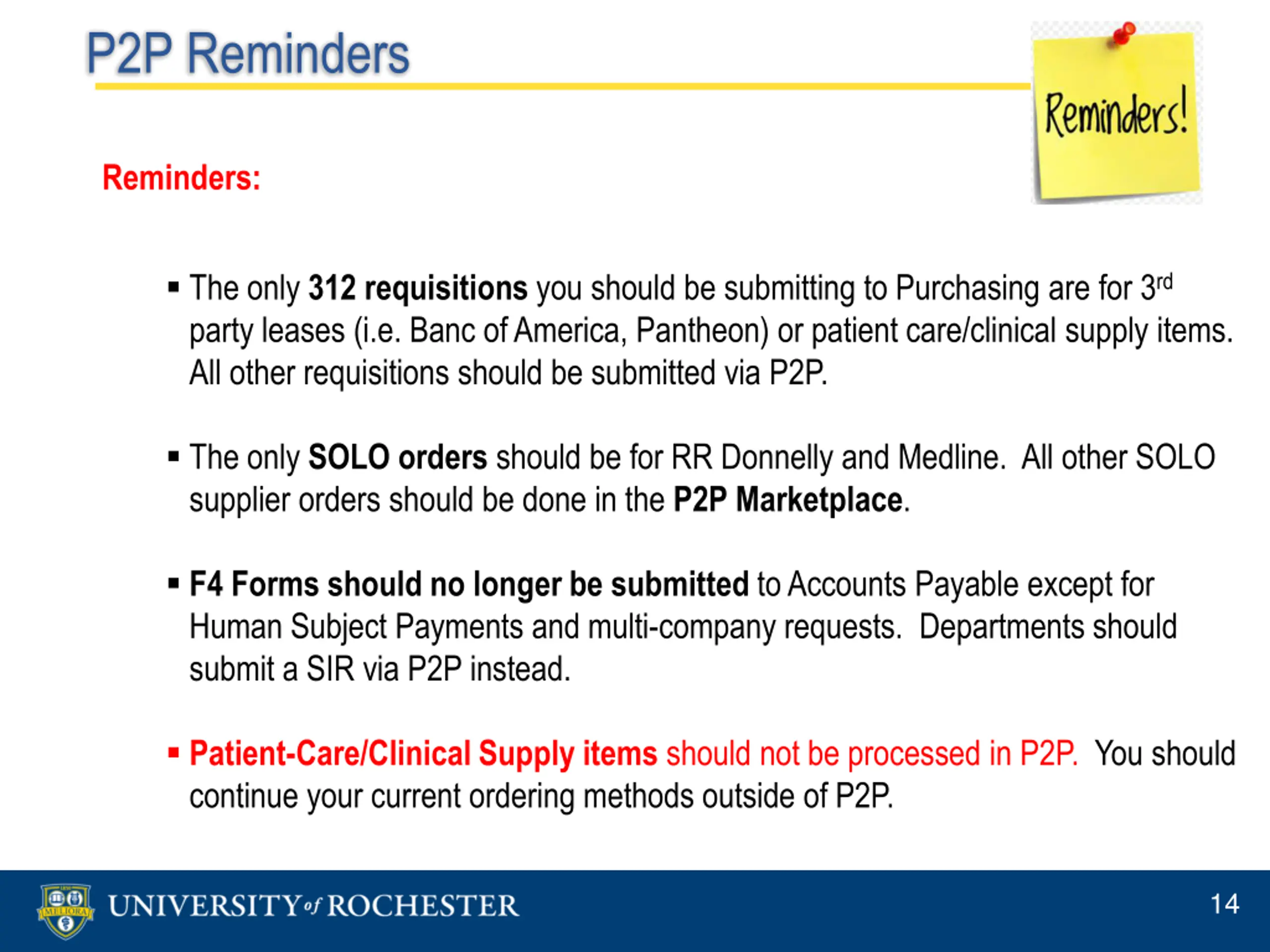 P2P Reminders Reminders: The only 312 requisitions you should be submitting to Purchasing are for 3rd party leases (i.e. Banc of America, Pantheon) or patient care/clinical supply items. All other requisitions should be submitted via P2P. The only SOLO orders should be for RR Donnelly and Medline. All other SOLO supplier orders should be done in the P2P Marketplace. F4 Forms should no longer be submitted to Accounts Payable except for Human Subject Payments and multi-company requests. Departments should submit a SIR via P2P instead. Patient-Care/Clinical Supply items should not be processed in P2P. You should continue your current ordering methods outside of P2P. 14