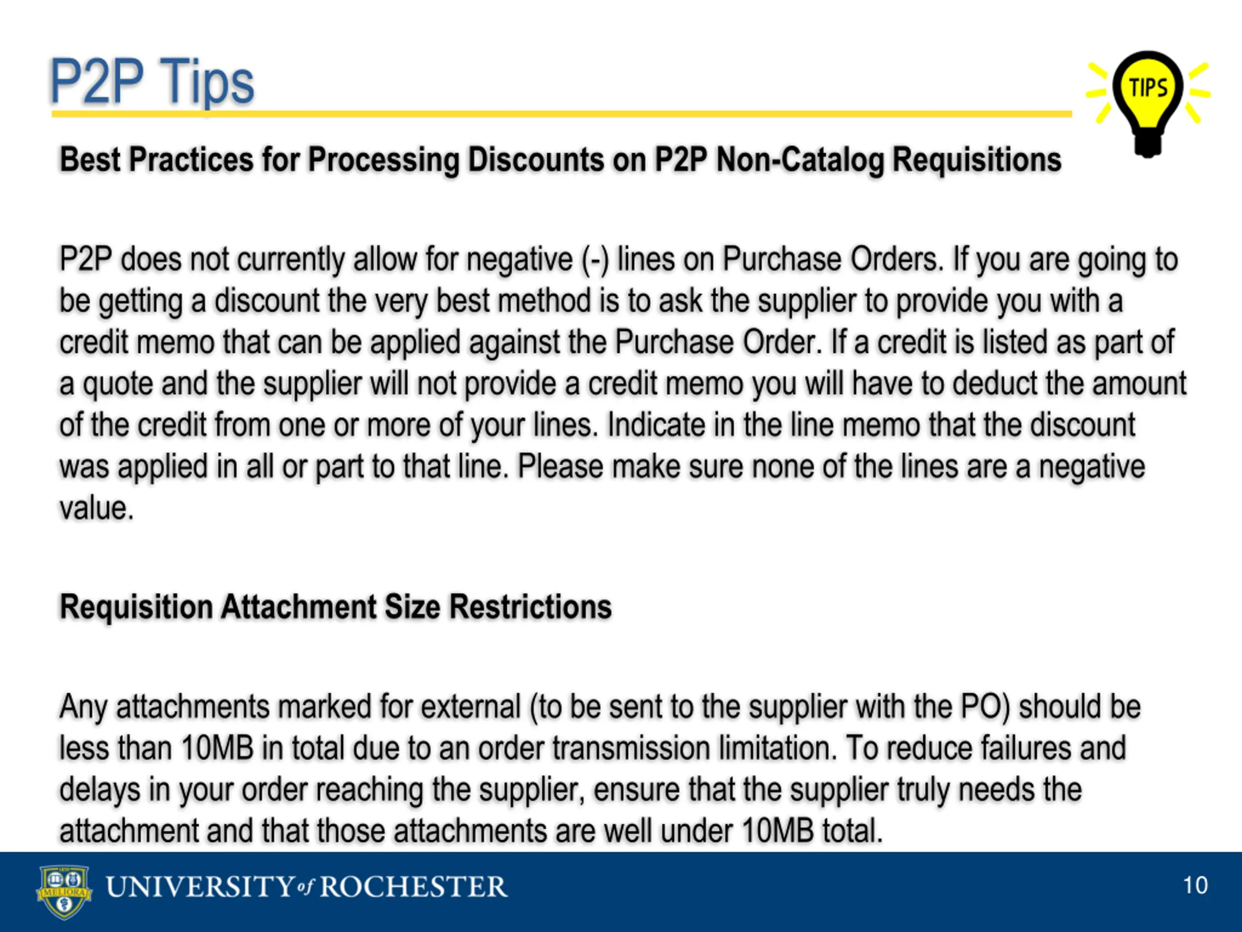 P2P Tips Best Practices for Processing Discounts on P2P Non-Catalog Requisitions P2P does not currently allow for negative (-) lines on Purchase Orders. If you are going to be getting a discount the very best method is to ask the supplier to provide you with a credit memo that can be applied against the Purchase Order. If a credit is listed as part of a quote and the supplier will not provide a credit memo you will have to deduct the amount of the credit from one or more of your lines. Indicate in the line memo that the discount was applied in all or part to that line. Please make sure none of the lines are a negative value. Requisition Attachment Size Restrictions Any attachments marked for external (to be sent to the supplier with the PO) should be less than 10MB in total due to an order transmission limitation. To reduce failures and delays in your order reaching the supplier, ensure that the supplier truly needs the attachment and that those attachments are well under 10MB total. 10
