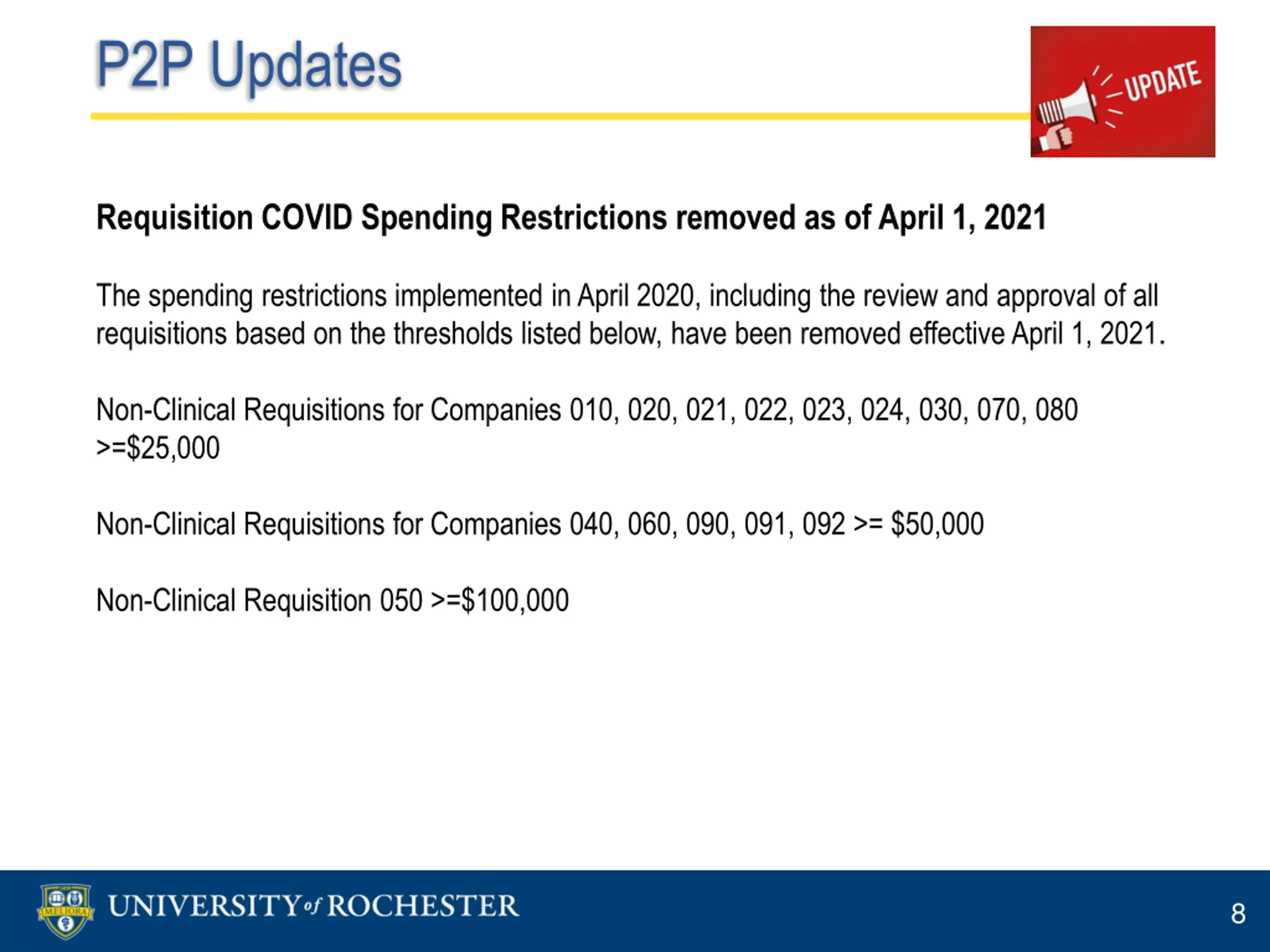 P2P Updates Requisition COVID Spending Restrictions removed as of April 1, 2021 The spending restrictions implemented in April 2020, including the review and approval of all requisitions based on the thresholds listed below, have been removed effective April 1, 2021. Non-Clinical Requisitions for Companies 010, 020, 021, 022, 023, 024, 030, 070, 080 >=$25,000 Non-Clinical Requisitions for Companies 040, 060, 090, 091, 092 >= $50,000 Non-Clinical Requisition 050 >=$100,000 8