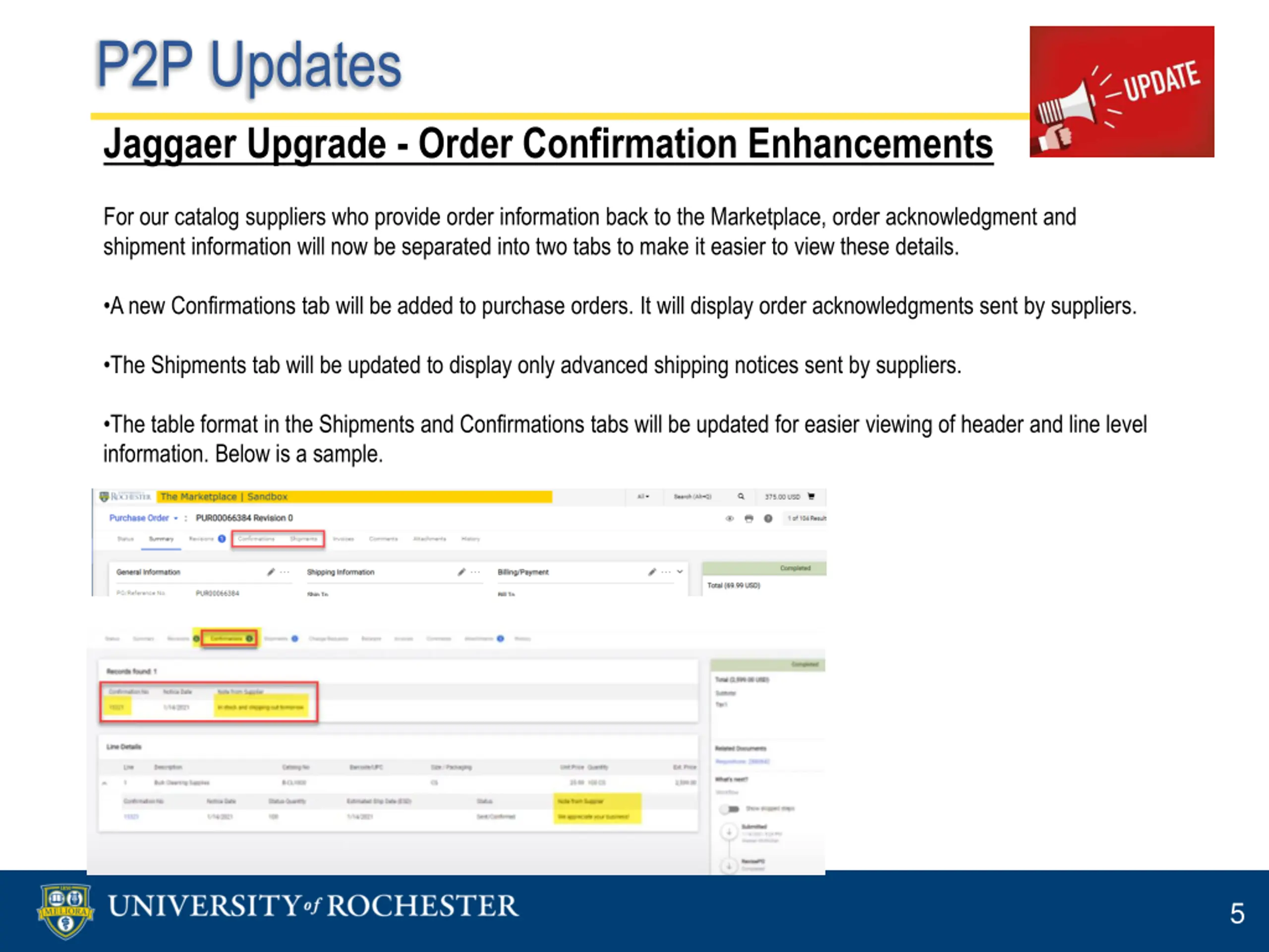 P2P Updates Jaggaer Upgrade - Order Confirmation Enhancements For our catalog suppliers who provide order information back to the Marketplace, order acknowledgment and shipment information will now be separated into two tabs to make it easier to view these details. A new Confirmations tab will be added to purchase orders. It will display order acknowledgments sent by suppliers. The Shipments tab will be updated to display only advanced shipping notices sent by suppliers. The table format in the Shipments and Confirmations tabs will be updated for easier viewing of header and line level information. Below is a sample. 5